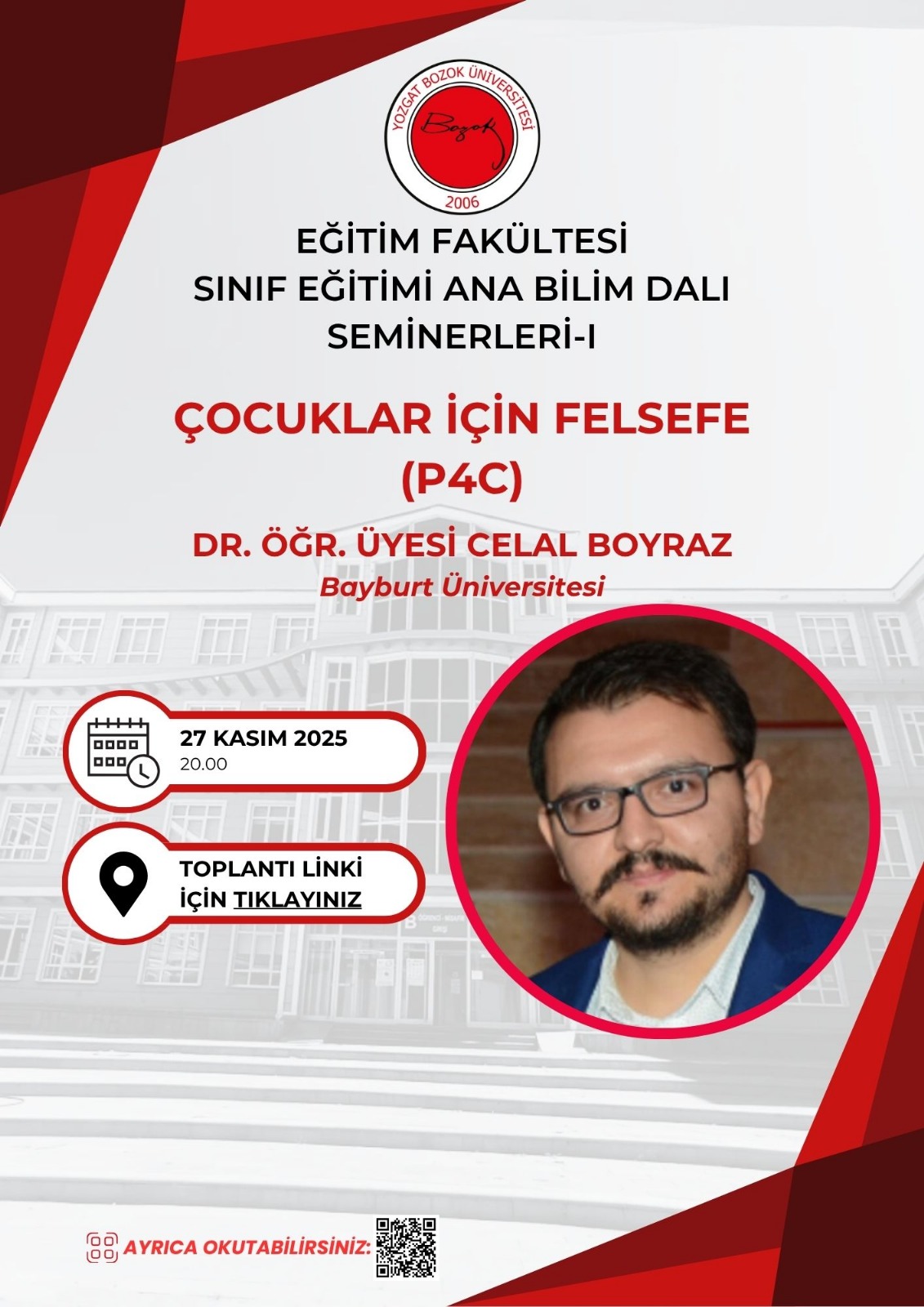 Temel Eğitim Bölümü Sınıf Eğitimi Ana Bilim Dalı tarafından “Sınıf Eğitimi Ana Bilim Dalı Seminerleri-I” kapsamında Çocuklar İçin Felsefe (P4C) konulu çevrim içi bir seminer düzenlenecektir.