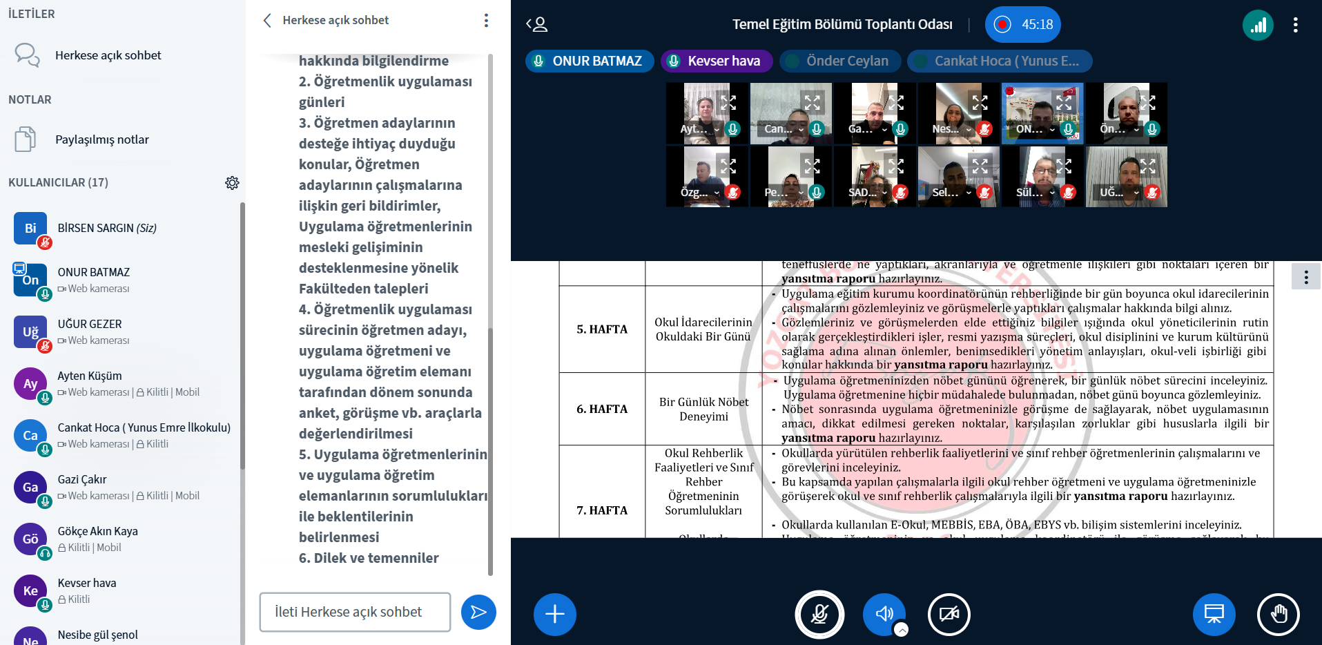 Toplantıda Öğretmenlik Uygulaması Dersi Kılavuzunun tanıtımının yanı sıra, sorumlu uygulama öğretmenlerinden genel değerlendirmeler alındı.