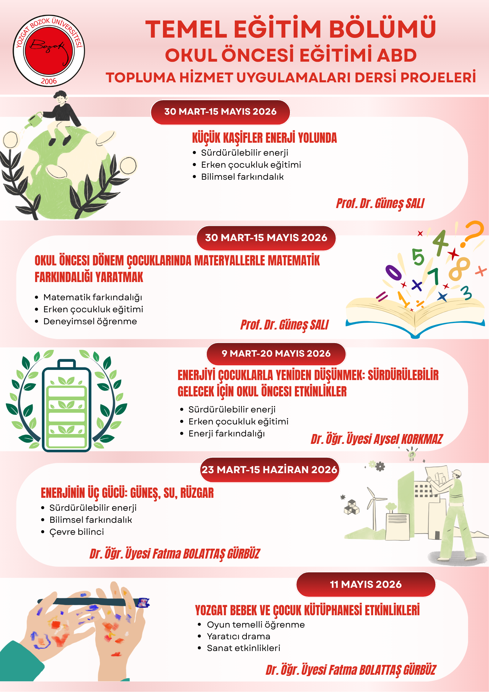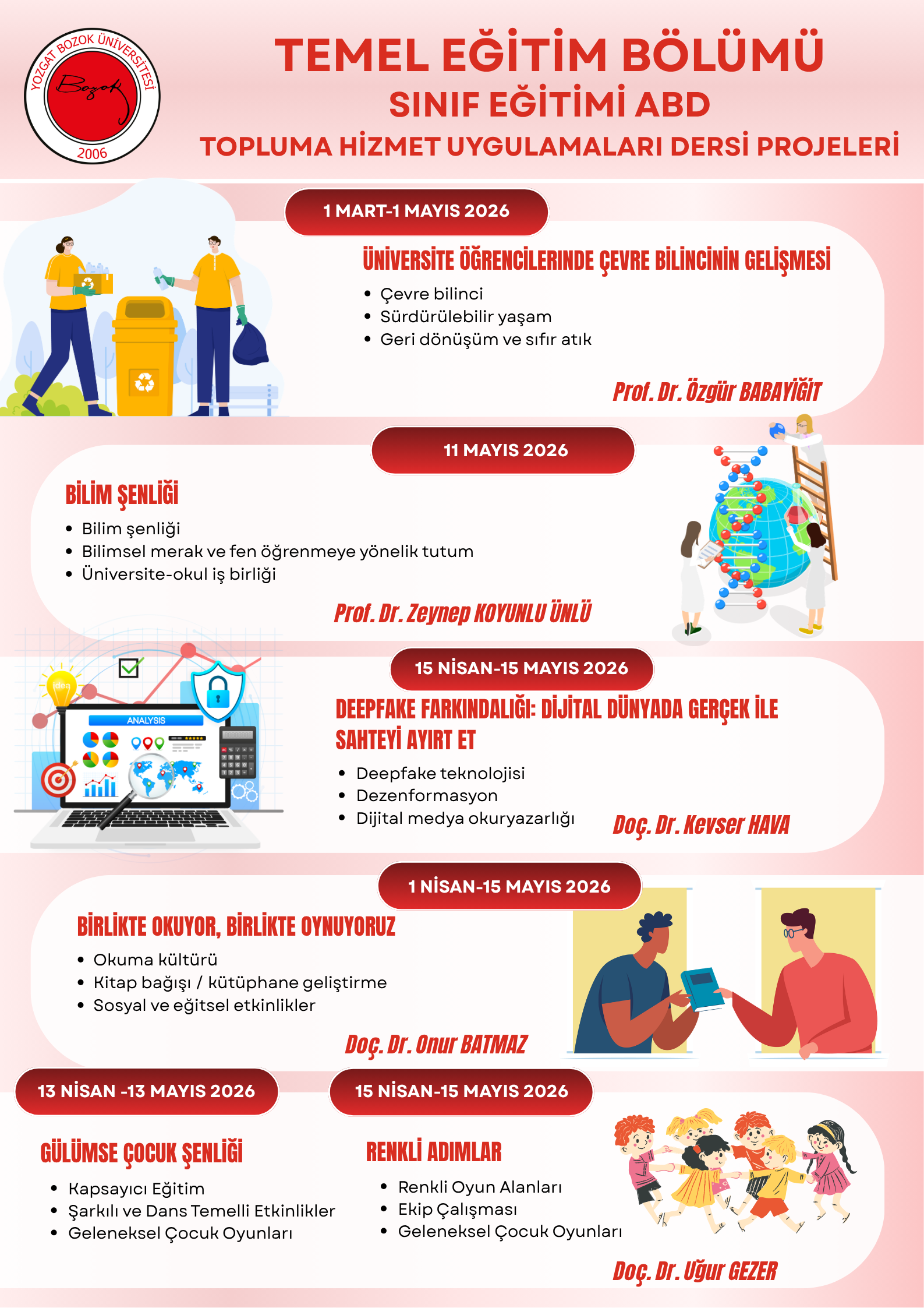 Yozgat Bozok Üniversitesi Eğitim Fakültesi Temel Eğitim Bölümü bünyesinde, Okul Öncesi Eğitimi ve Sınıf Eğitimi Anabilim Dalları tarafından yürütülen Topluma Hizmet Uygulamaları Dersi kapsamında hazırlanan projeler, 2026 yılı bahar döneminde hayata geçirilmektedir.