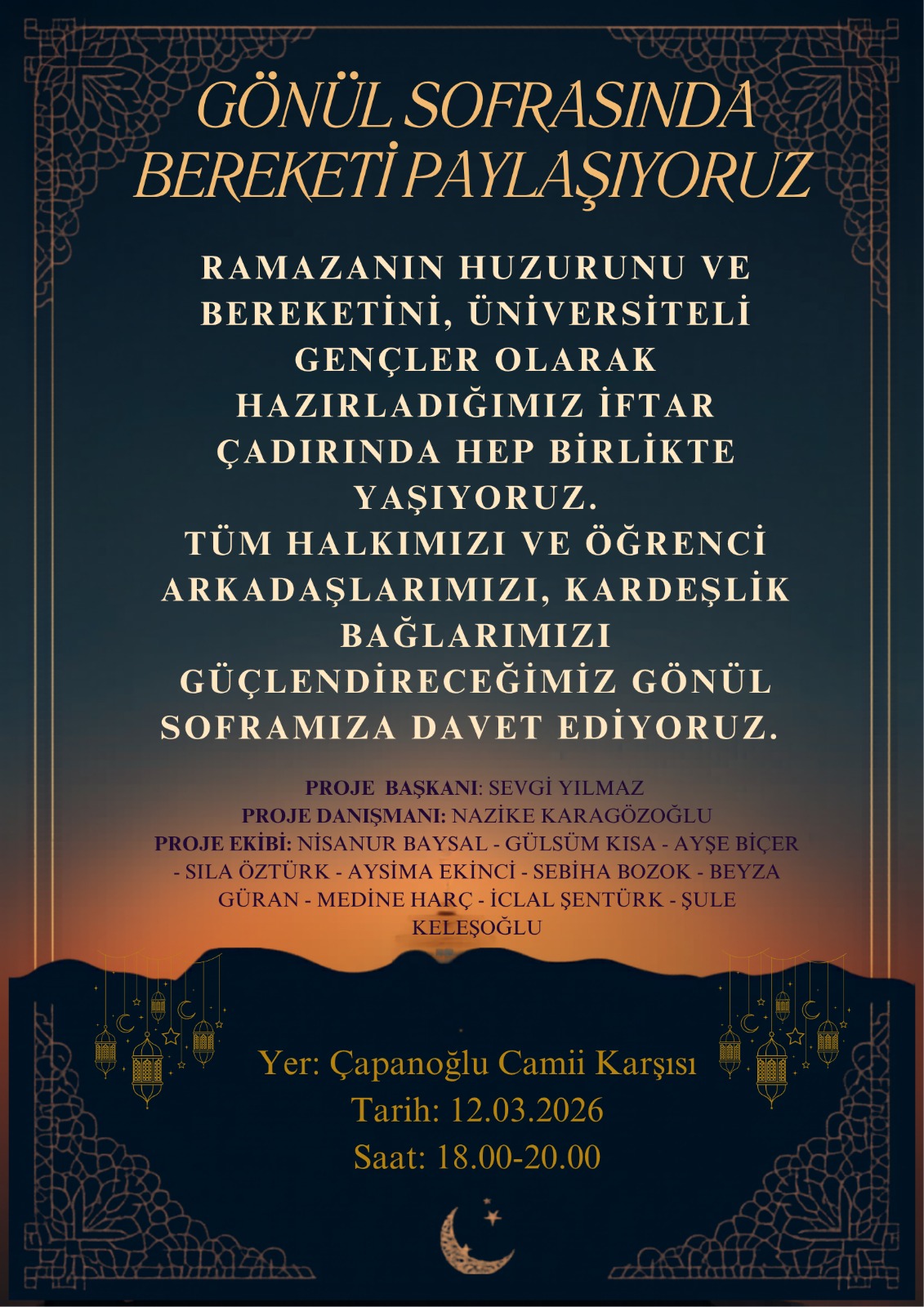 Projede temel amaç, Ramazan ayının ruhuna uygun olarak toplumsal dayanışmayı güçlendirmek, paylaşma kültürünü yaşatmak ve üniversiteli gençler olarak yerel halkla gönül köprüleri kurmaktır.