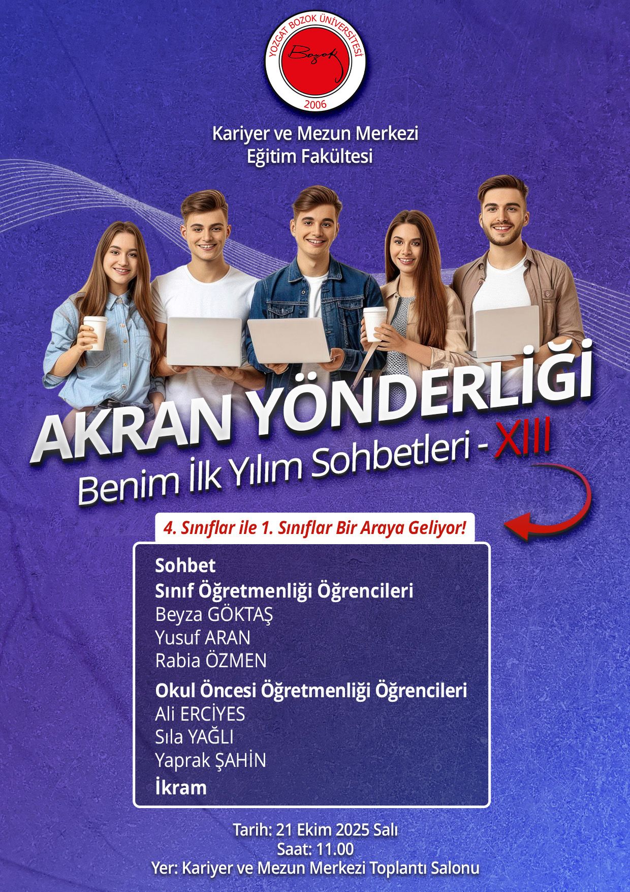 Yozgat Bozok Üniversitesi Kariyer ve Mezun Merkezi koordinasyonunda düzenlenen “Akran Yönderliği: Benim İlk Yılım Sohbetleri” etkinliği, 21 Ekim 2025 Salı günü saat 11.00’de Kariyer ve Mezun Merkezi Toplantı Salonu’nda gerçekleştirildi.