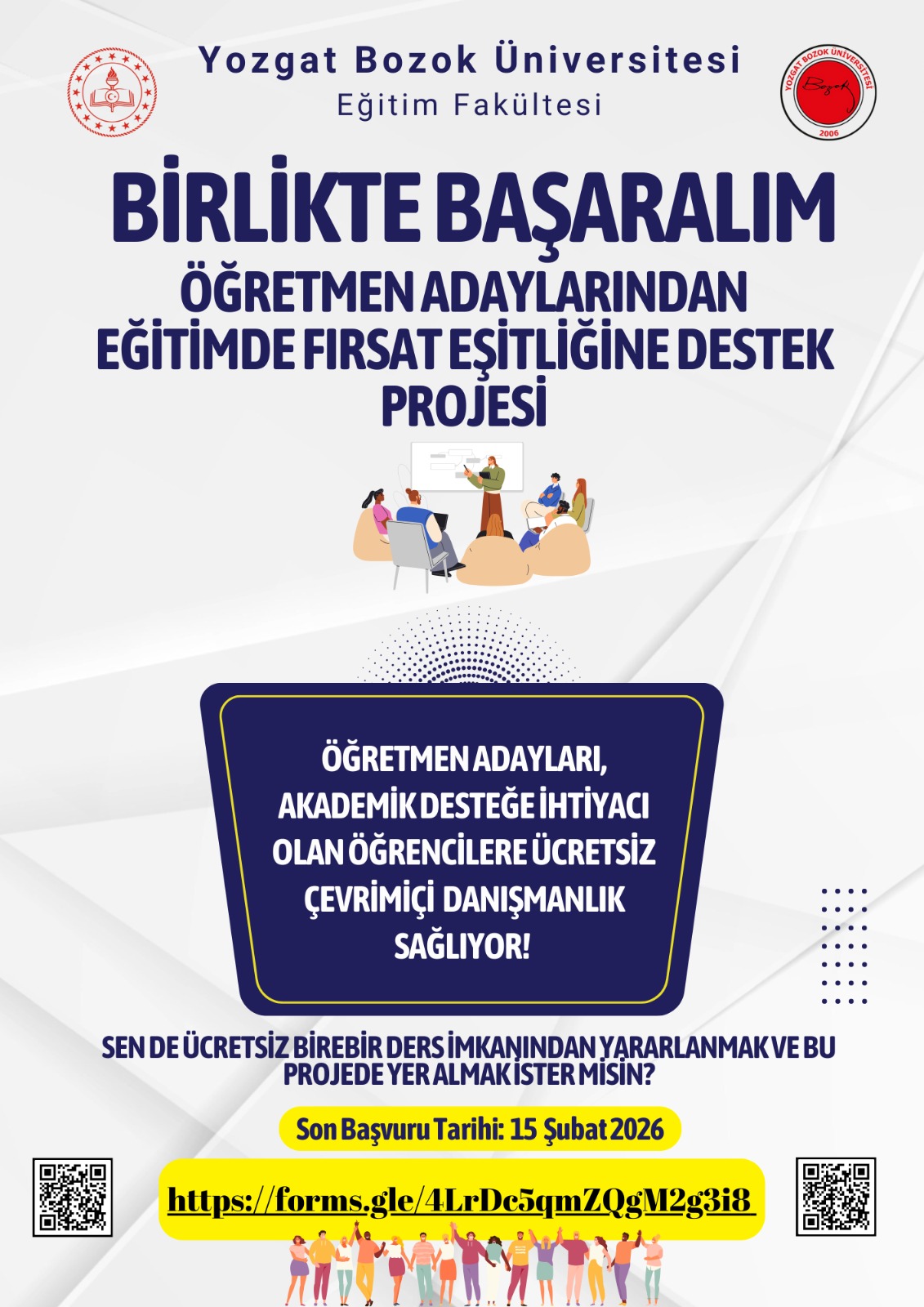 Kurulduğu günden bu yana toplumsal katkıya önem veren ve sosyal sorumluluk projelerini önemli bir misyon olarak kabul eden Yozgat Bozok Üniversitesi Eğitim fakültesi, öğrencilere ücretsiz olarak birebir ders alma olanağı sunan projesinin ikincisini hayata geçiriyor. Proje kapsamında öğrencilerin, çeşitli derslerde akademik başarılarını arttırmaya yönelik olarak öğretmen adayları tarafından birebir ders verilecektir. Dersler, üniversitemizin uzaktan eğitimi sistemi BOYSİS üzerinden çevrimiçi olarak gerçekleştirilecektir. Başvuru sonuçları eğitim fakültesi web sayfasından ilan edilecek olup aynı zamanda formda belirtmiş olduğunuz iletişim adreslerine de bilgilendirme yapılacaktır. Geleceğimizin teminatı olan öğrencilerimizi projemizden yararlanmaya davet ediyoruz.