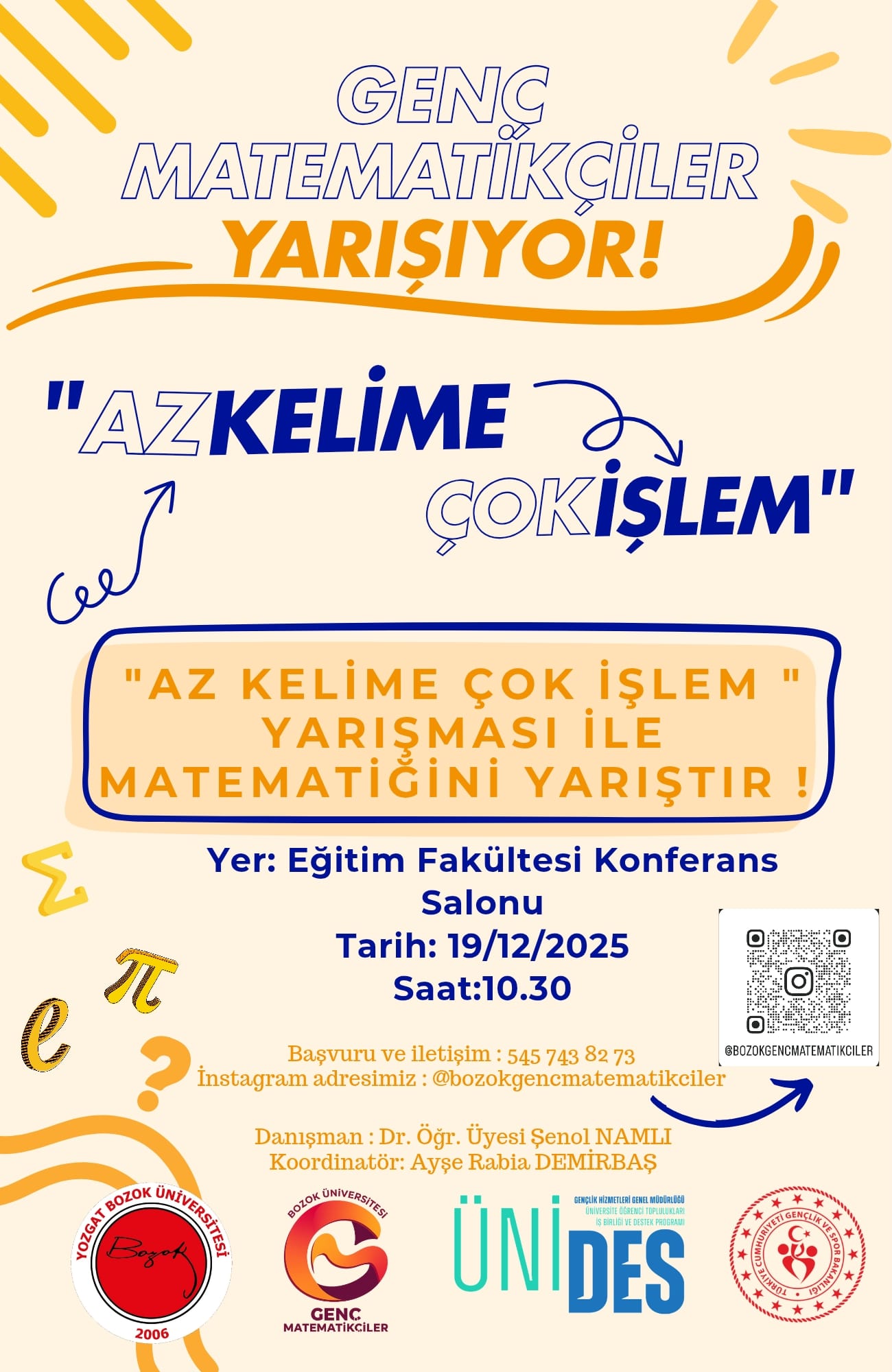 Yozgat Bozok Üniversitesi Eğitim Fakültesi Matematik Eğitimi Anabilim Dalı bünyesinde faaliyet gösteren Genç Matematikçiler Topluluğu, TRT’nin klasik bilgi yarışmalarından “Bir Kelime Bir İşlem” programından esinlenerek hazırladığı “Az Kelime Çok İşlem” adlı yarışma ile öğrencileri kelime türetme ve işlem becerisi alanlarında bir araya getiriyor. Eğlenceli ve rekabet dolu bir atmosferde gerçekleşecek olan yarışmaya, işlem becerisine ve kelime bilgisine güvenen tüm katılımcıları davet ediyoruz.