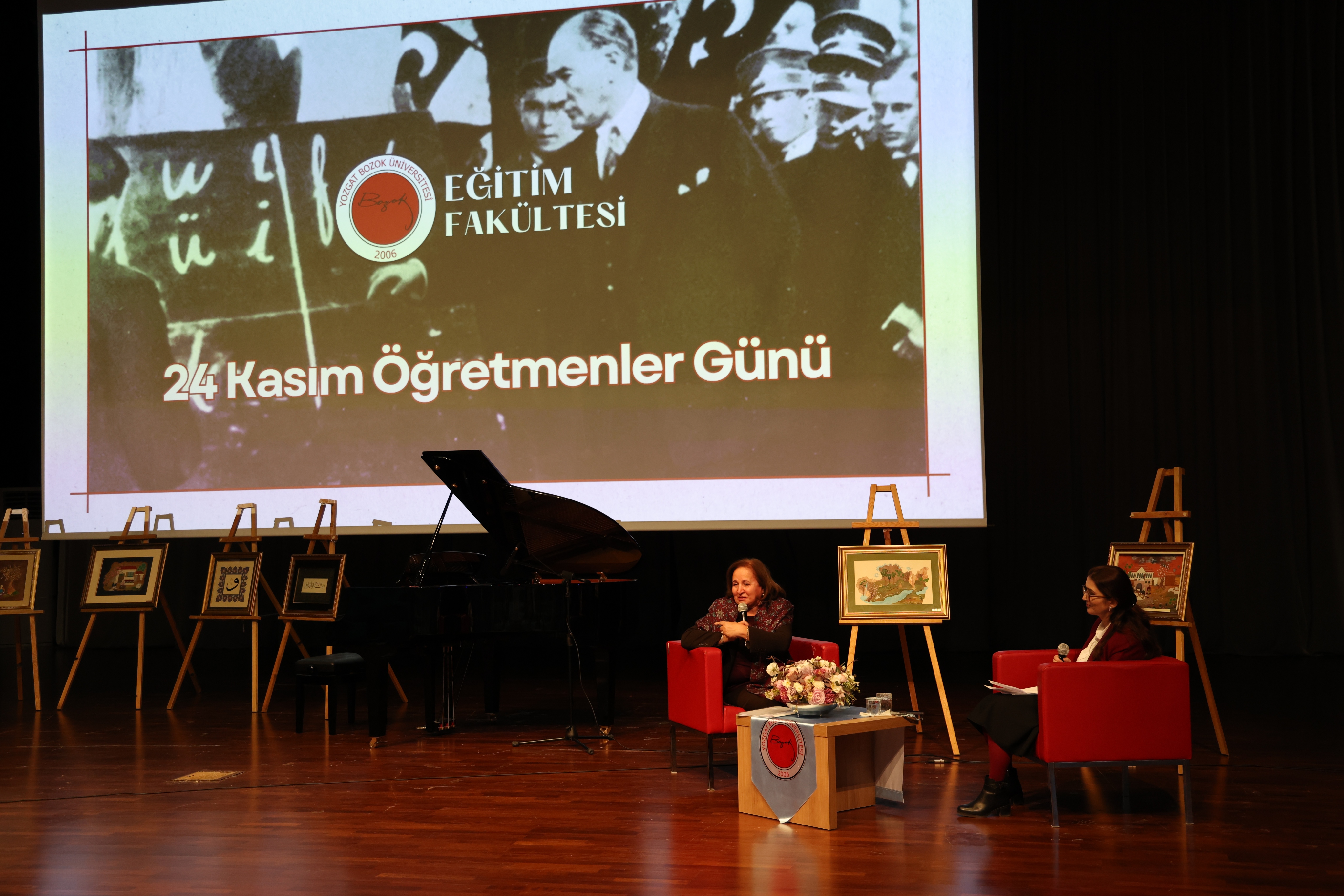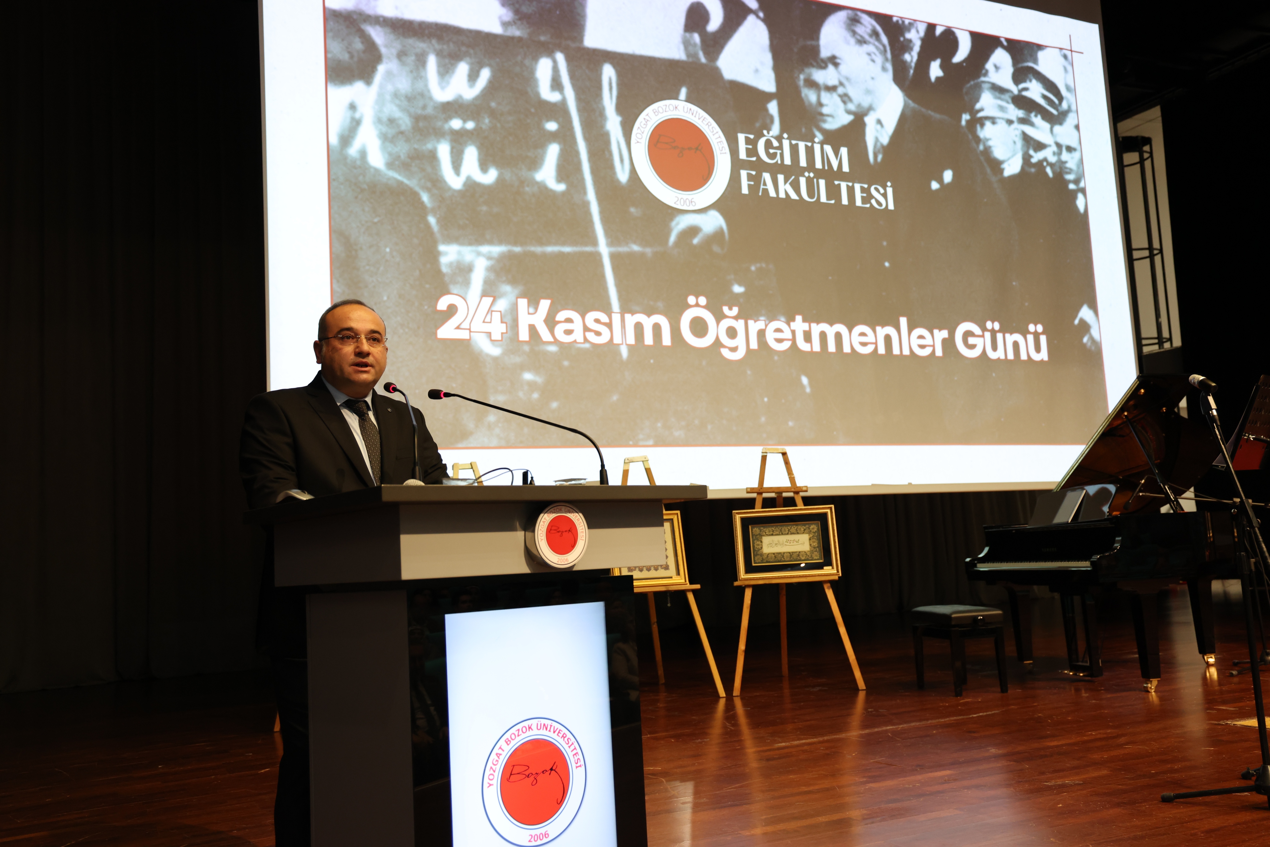 Programın açılış konuşmasını yapan Üniversitemiz Eğitim Fakültesi Dekanı Prof. Dr. Gürsel GÜLER, öğretmenliğin, yalnızca bir meslek değil; ülkelerin kaderini biçimlendiren en stratejik görevlerden biri olduğunu söyledi. Prof. Dr. Güler konuşmasının devamında: “Bugün burada, bir milletin kültürünü, hafızasını, idealini ve geleceğe dair bütün umutlarını temsil eden öğretmenlik mesleğini onurlandırmak için toplandık. Başöğretmenimiz Gazi Mustafa Kemal Atatürk, öğretmeni toplumun kaderini değiştiren bir irade olarak tanımlamış ve "Bir milletin gerçek kurtuluşu, ancak öğretmenlerin göstereceği çabayla mümkün olur." sözleriyle bu sorumluluğu açıkça ifade etmiştir. 24 Kasım; yalnızca görevdeki öğretmenlerimizin günü değil, aynı zamanda bu ülkenin dört bir yanında geleceğe ışık taşırken şehit düşen öğretmenlerimizi rahmet ve minnetle andığımız çok özel bir gündür. Bu vesileyle Başöğretmenimiz Gazi Mustafa Kemal Atatürk başta olmak üzere, ebediyete irtihal eden tüm öğretmenlerimizi ve görevini ifa ederken şehit düşen kahraman öğretmenlerimizi rahmet ve minnetle anıyor, görevini onurla sürdüren tüm öğretmenlerimizin 24 Kasım Öğretmenler Günü'nü yürekten kutluyorum.” dedi.