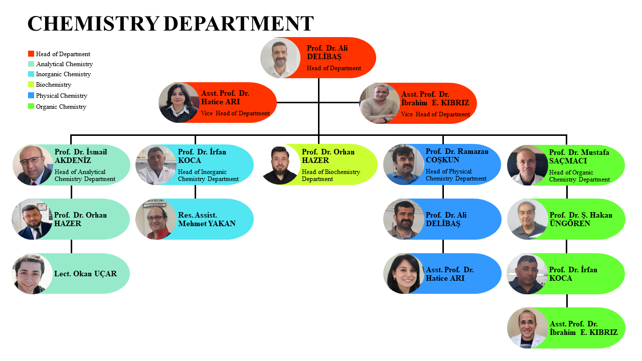In the Chemistry Department, there are Analytical, Inorganic, Physical Chemistry, Organic Chemistry and Biochemistry departments. There are 7 Professors, 2 Assistant Professor Doctor, 1 Research Assistant and 1 Lecturer in the Chemistry Department.