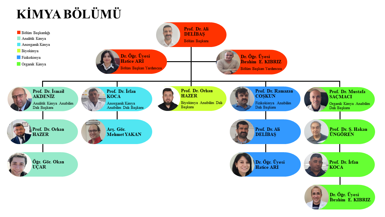 Kimya Bölümünde Analitik, Anorganik, Fizikokimya, Organik kimya ve Biyokimya anabilim dalları mevcuttur. Kimya Bölümünde 7 Profesör, 2 Doktor Öğretim Üyesi, 1 Araştırma Görevlisi ve 1 Öğretim Görevlisi bulunmaktadır.