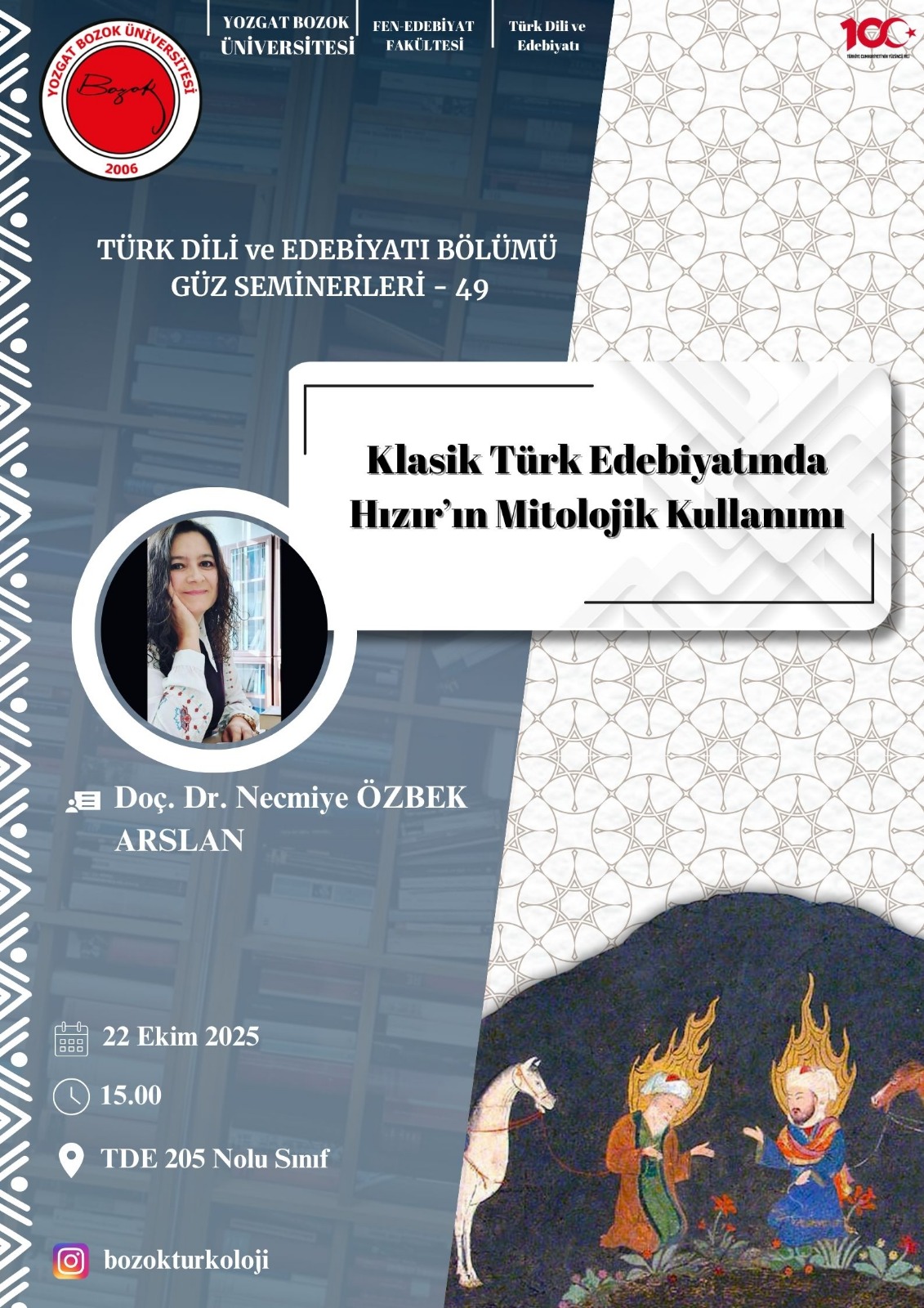 22.10.2025 tarihinde saat 15:00'ta TDE Bölümü 205 No'lu derslikte bölümümüz öğretim elemanlarından Doç. Dr. Necmiye ÖZBEK ARSLAN tarafından "Klasik Türk Edebiyatında Hızır'ın Mitolojik Kullanımı" adlı seminer gerçekleştirilecektir.