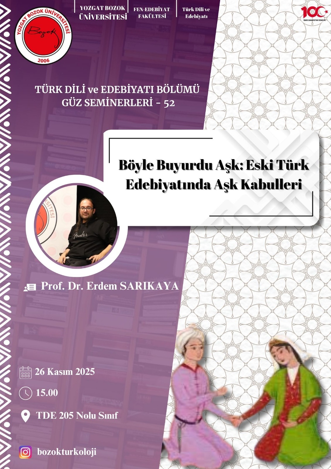 26.11.2025 tarihinde saat 15:00'ta TDE Bölümü 205 No'lu derslikte bölümümüz öğretim elemanlarından Prof. Dr. Erdem SARIKAYA tarafından "Böyle Buyurdu Aşk: Eski Türk Edebiyatında Aşk Kabülleri" adlı seminer gerçekleştirilecektir.