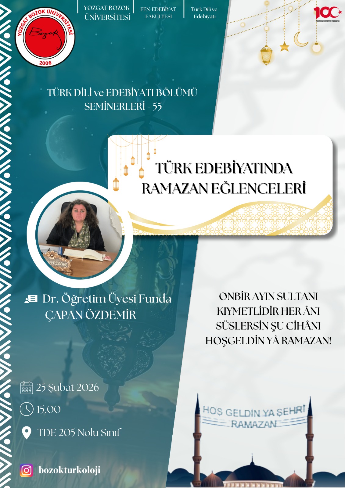 25.02.2026 tarihinde, saat 15:00'te TDE Bölümü 205 No'lu derslikte bölümümüz öğretim elemanlarından Dr. Öğr. Üyesi Funda ÇAPAN ÖZDEMİR tarafından "Türk Edebiyatında Ramazan Eğlenceleri" adlı seminer gerçekleştirilecektir.