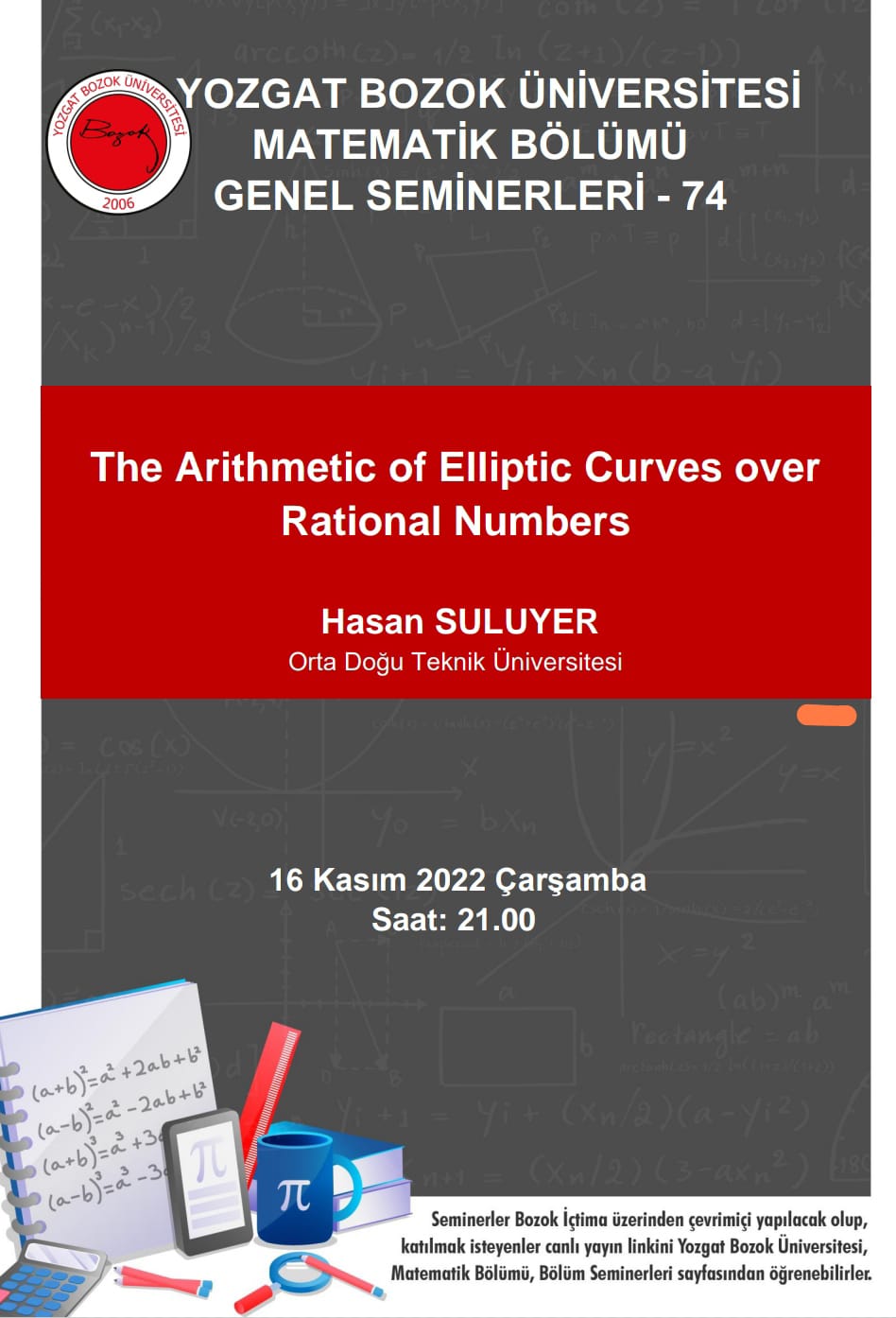 Özet : Bu konuşmada n değişkenli rasyonel katsayılı polinomların rasyonel kökleri hakkında bazı bilgiler vereceğim. Bu polinomların bir kısmı hiperdüzlemlere, koniklere ya da kübiklere tekabül edebilir. Sonra, kübiklerin üzerine belli şartlar ekleyerek rasyonel sayılar üzerinde eliptik eğrileri tanımlayıp onlar üzerindeki aritmetik hakkında konuşacağız. Daha sonra, konuşmamı günümüzde kriptolojide şifrelemede kullanılan eliptik eğriler üzerindeki cebirsel yapı ile tamamlayacağım.