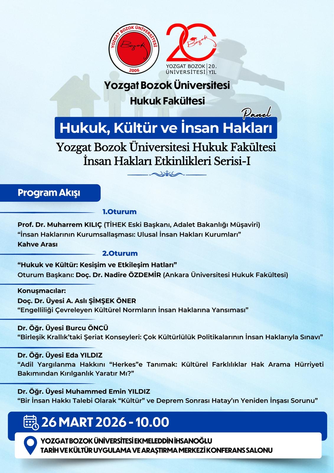 Hukuk, Kültür ve İnsan Hakları Paneli 26 Mart 2026 Perşembe günü saat 10:00'da Yozgat Bozok Üniversitesi Ekmeleddin İhsanoğlu Tarih ve Kültür Uygulama ve Araştırma Merkezi Konferans Salonu'nda gerçekleştirilecektir.