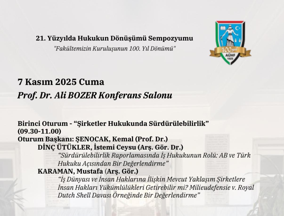 Ankara Üniversitesi Hukuk Fakültesi kuruluşunun 100. yılı kapsamında düzenlenen 21. Yüzyılda Hukukun Dönüşümü Sempozyumu'na katılım sağlandı. Fakültemiz İş ve Sosyal Güvenlik Hukuku ABD'da görevli Arş. Gör. Dr. İstemi Ceysu DİNÇ ÜTÜKLER, mezunu olduğu Ankara Üniversitesi Hukuk Fakültesi'nin kuruluşunun 100. yılı anısına 3-7 Kasım tarihleri arasında düzenlenen 21. Yüzyılda Hukukun Dönüşümü Sempozyumu'nda "Sürdürülebilirlik Raporlamasında İş Hukukunun Rolü: AB ve Türk Hukuku Açısından Bir Değerlendirme" başlıklı bildirisini sunmuştur.
