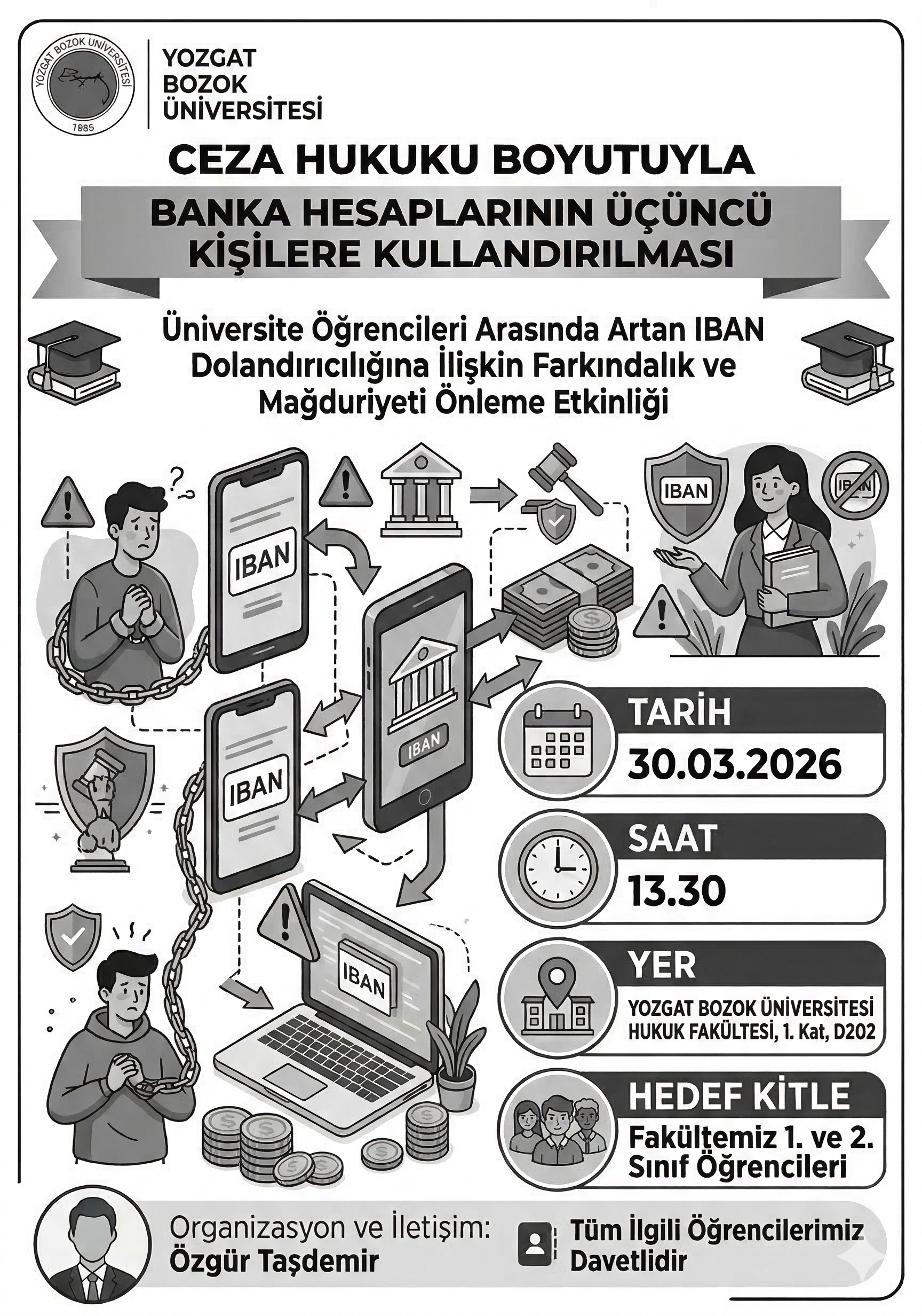Üniversite öğrencileri arasında artış gösteren ve IBAN kullandırılması suretiyle gerçekleştirilen dolandırıcılık olaylarına ilişkin farkındalığı artırmak ve bireysel mağduriyeti önlemek amacıyla, 30.03.2026 Pazartesi günü saat 13.30'da Hukuk Fakültesi 1. Kat D-202 numaralı derslikte Dr. Öğr. Üyesi Özgür Taşdemir tarafından "Ceza Hukuku Boyutuyla Banka Hesaplarının Üçüncü Kişilere Kullandırılması" konulu bir bilgilendirme toplantısı yapılacak olup tüm 1. ve 2. sınıf öğrencilerinin anılan toplantıya katılımı zorunludur.