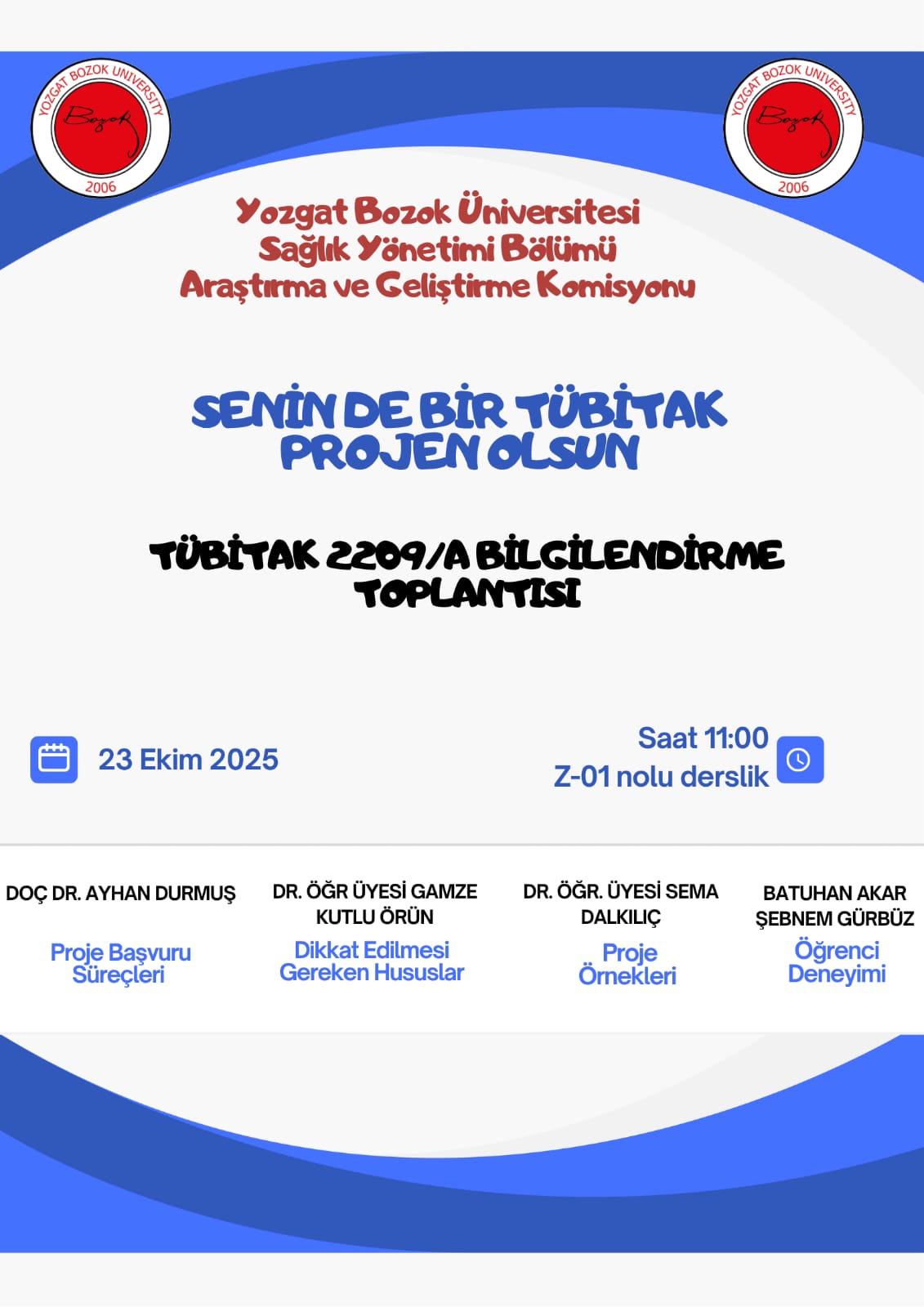 Yozgat Bozok Üniversitesi Sağlık Yönetimi Bölümü Araştırma ve Geliştirme Komisyonu tarafından düzenlenen “Senin de Bir TÜBİTAK Projen Olsun” başlıklı bilgilendirme toplantısına tüm öğrencilerimiz davetlidir.