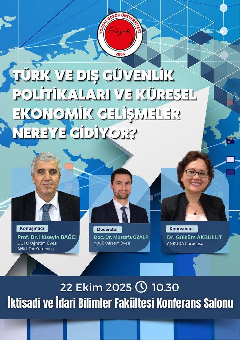 Bölümümüz Öğretim Üyelerinden Doç. Dr. Mustafa Özalp tarafından düzenlenen, 22 Ekim 2025 saat 10.30’da İİBF Konferans salonunda yapılacak olan Dış Güvenlik Politikaları ve Küresel Ekonomik Gelişmeler Nereye Gidiyor? başlıklı panele tüm öğrencilerimizi bekliyoruz…