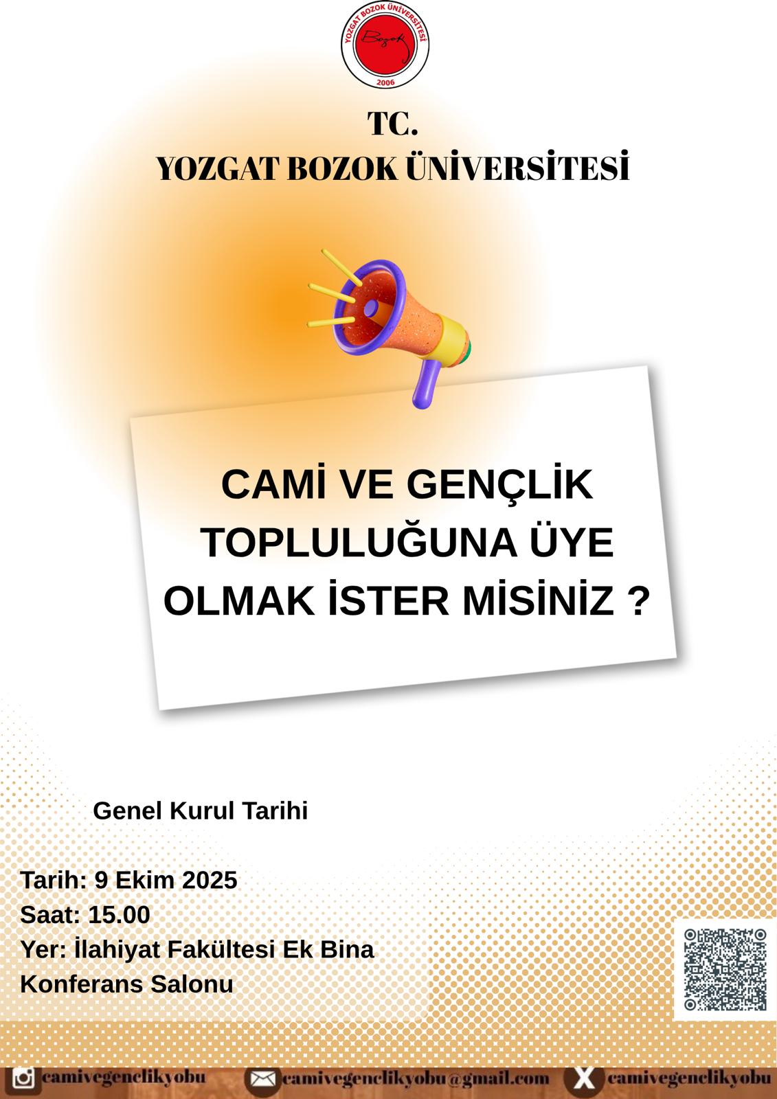 Cami ve gençlik topluluğu genel kurul toplantısı 9 Ekim perşembe günü saat 12:00 de ek bina konferans salonunda yapılacaktır. Topluluğumuzda varlığı ve fikirleri ile bizlere katkı sunacak öğrencilerimizi aramızda görmek isteriz.