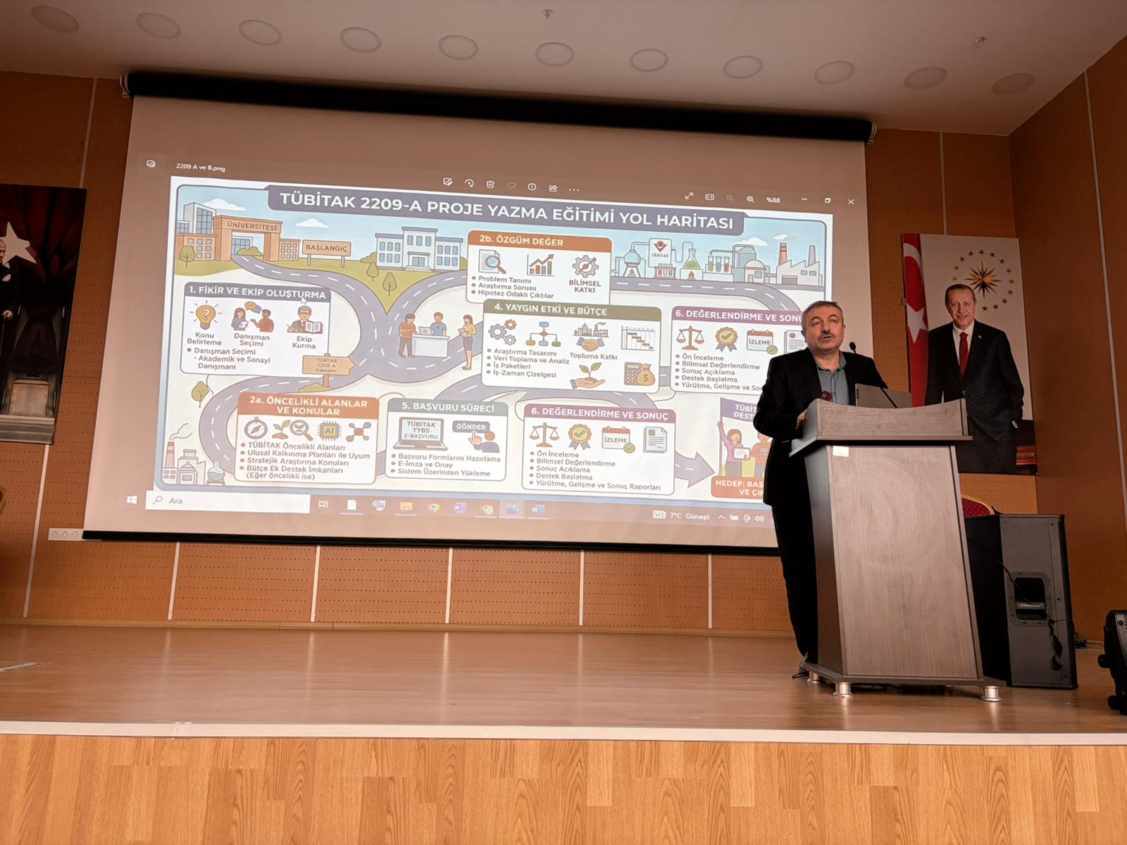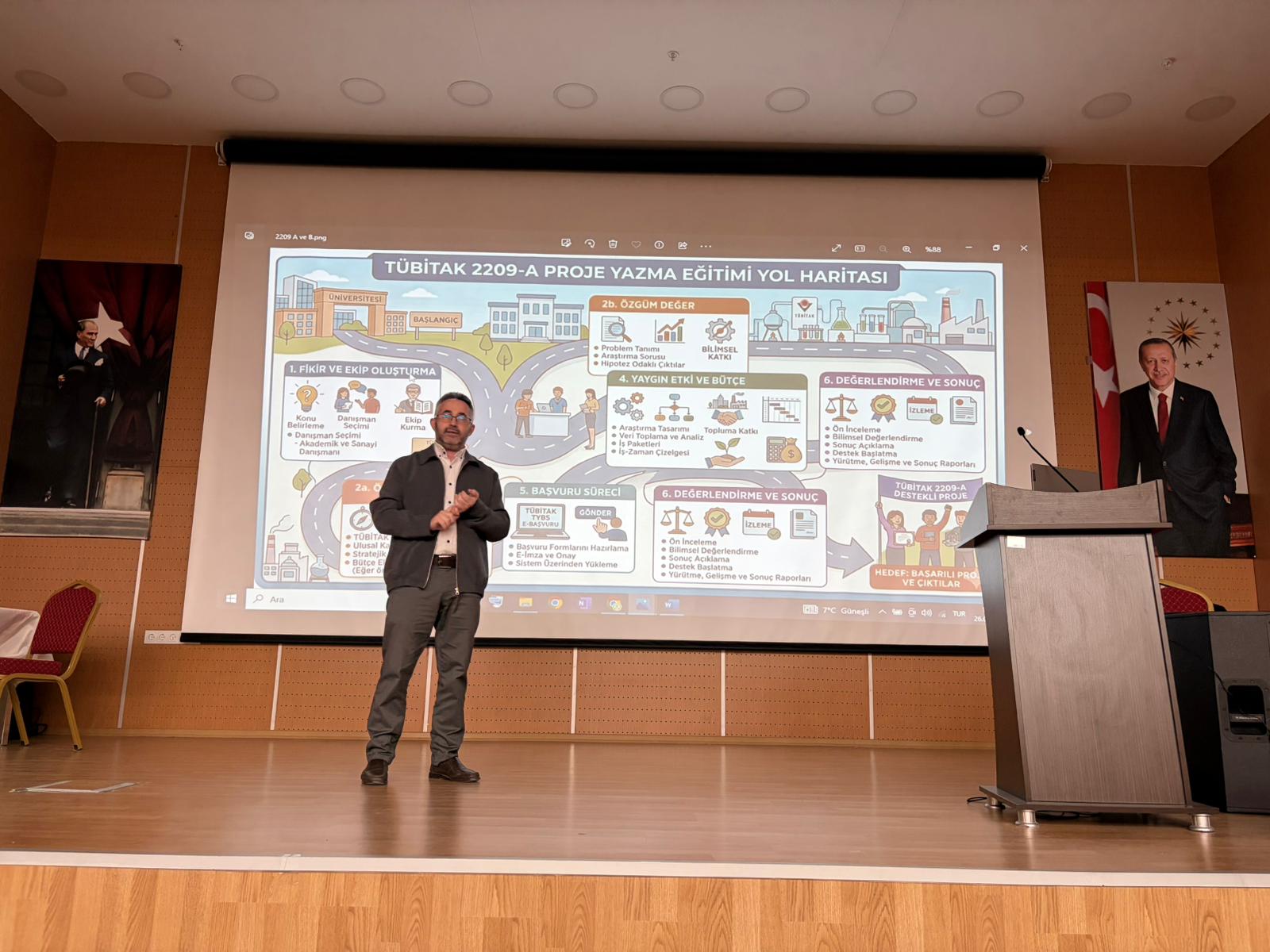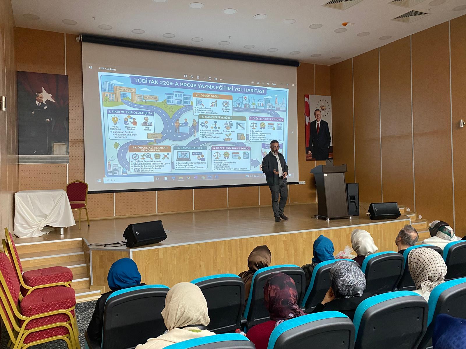 Sunumda; problem tanımlama, özgün değer ortaya koyma, yöntem belirleme, yaygın etki ve bütçe planlama gibi temel aşamalar ayrıntılı biçimde ele alındı. Ayrıca, akademik yazımda dikkat edilmesi gereken hususlar ve hakem değerlendirme süreçlerine nasıl etkin şekilde cevap verilebileceği konusunda da pratik öneriler sunuldu.