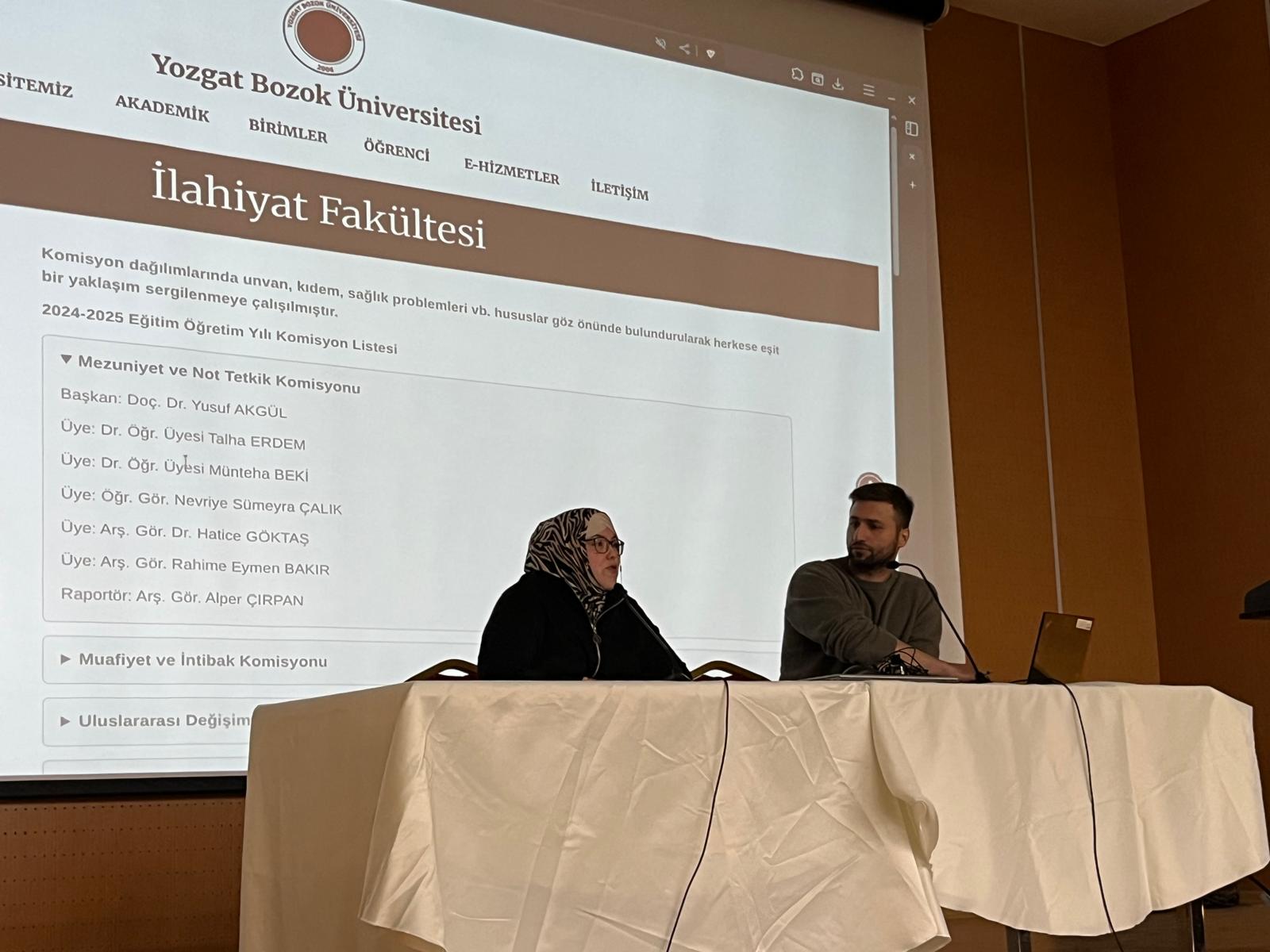 01 Aralık 2025 tarihinde İlahiyat Fakültesi Ek Bina Konferans Salonu’nda, 2025–2026 Eğitim-Öğretim Yılı Ders Başarı Değerlendirme Sistemine ilişkin Dr. Öğr. Üyesi İhsan Övge Öztürk tarafından bilgilendirme toplantısı yapılmıştır. Toplantıda yeni bağıl not sistemi akademik personele tanıtılmış; değerlendirmenin esasları, işleyişi ve öğrenci başarı notlarının belirlenmesine yönelik süreçler açıklanmıştır. Aynı gün gerçekleştirilen ikinci oturumda ise fakülte komisyonlarının işleyişini değerlendirmeye yönelik bir toplantı yapılmış, bazı komisyonların birleştirilmesi ve komisyonların daha verimli çalışacak şekilde düzenlenmesine karar verilmiştir.