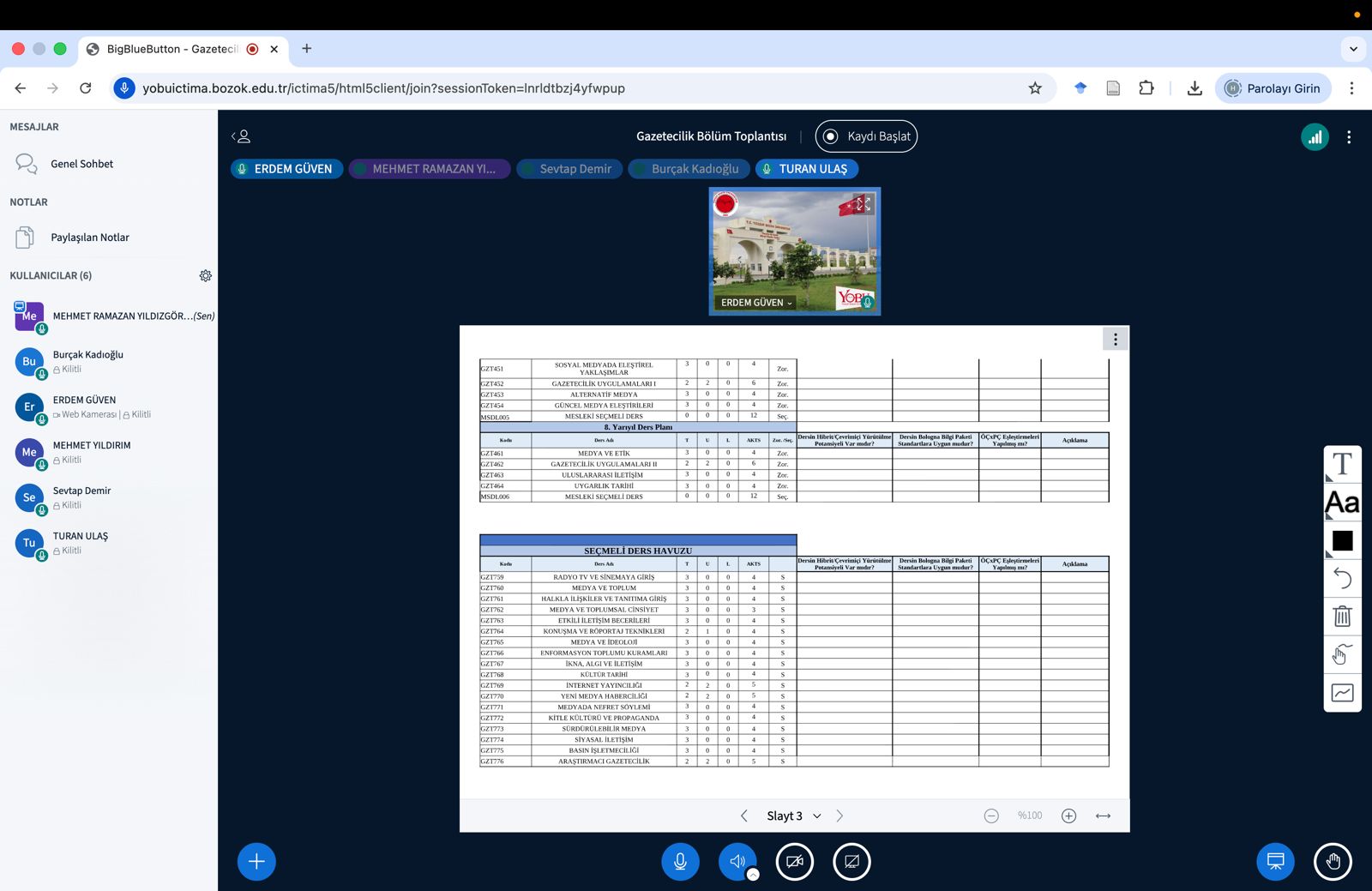 Bölümümüz tarafından gerçekleştirilen toplantıda, müfredat güncellemeleri, güncel öğrenme sistemlerine uyum ve dijital dönüşüm süreçleri ele alındı. Bu çerçevede ders içeriklerinin güncellenmesi, öğrencilerin dijital becerilerinin geliştirilmesi ve eğitim süreçlerinin çağın gerekliliklerine uygun hale getirilmesi konuları üzerinde duruldu. Bunun yanı sıra bölümün mevcut işleyişi değerlendirildi, planlanan etkinlikler, akademik gelişim süreçleri ve projeler üzerine görüş alışverişinde bulunuldu. Toplantıda ayrıca öğrenci katılımını artıracak faaliyetler ve akademik üretkenliği destekleyecek çalışmalar ele alınarak, bölümün eğitim-öğretim kalitesini güçlendirmeye yönelik öneriler ve görüşler konuşuldu.
