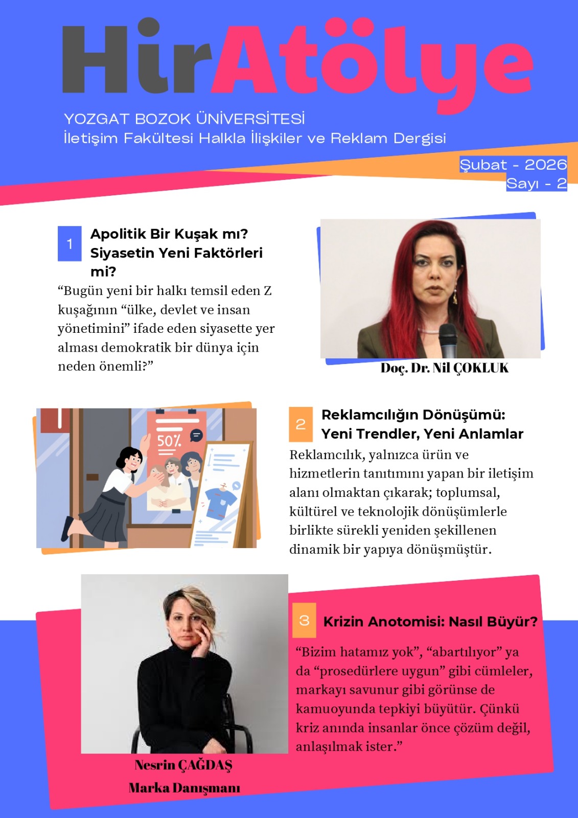 HİR Atölye Dergisi, öğrencilerin iletişim alanındaki üretimlerini görünür kılmayı ve uygulamalı eğitim sürecini desteklemeyi amaçlıyor. Şubat 2026’da yayımlanan ikinci sayı, öğrencilerin yaratıcı çalışmalarını bir araya getirerek atölye dersinin önemli çıktılarından biri olarak dikkat çekiyor.