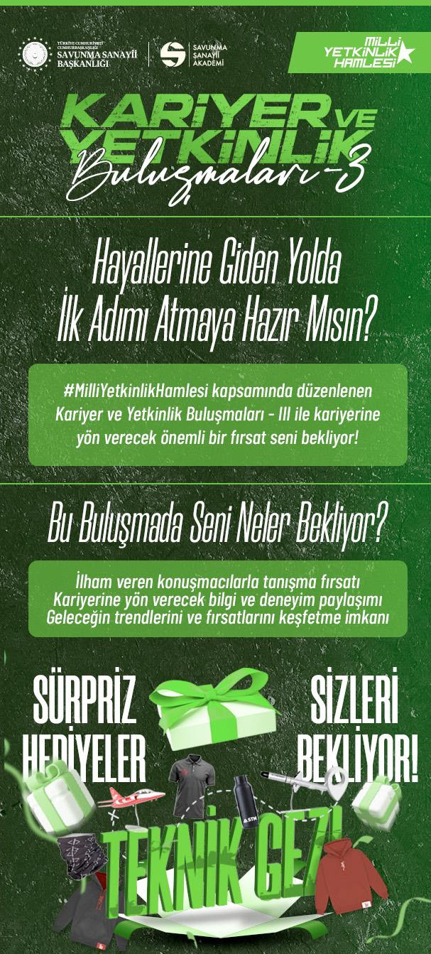 Milli Yetkinlik Hamlesi kapsamında düzenlenen kariyer ve yetkinlik buluşmaları 3 ile ilgili kayıt olmak ve detaylı bilgi almak için tıklayınız.