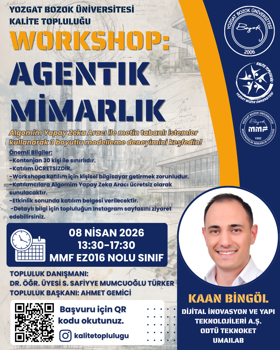 Yozgat Bozok Üniversitesi bünyesinde faaliyet gösteren Kalite Topluluğu tarafından, Mimarlık Bölümü öğretim üyesi Dr. Öğr. Üyesi Sadakat Safiyye Mumcuoğlu Türker’in koordinasyonunda, mimarlık ve yapay zekâ kesişiminde güncel yaklaşımları ele alan “Agentic Mimarlık Workshopu” düzenlenecektir.