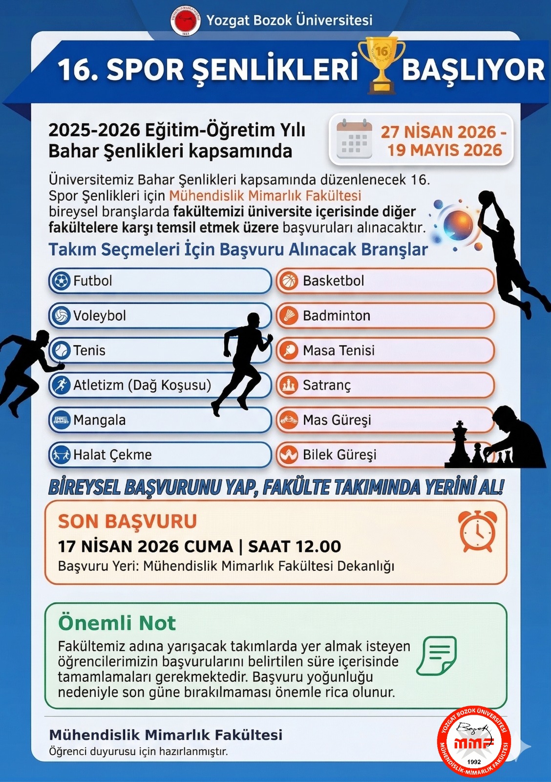 Mühendislik Mimarlık Fakültemiz adına bireysel veya takım sporlarına katılmak isteyen öğrencilerimizin, 17 Nisan 2026 Cuma günü saat 12.00’ye kadar başvurularını Mühendislik Mimarlık Fakültesi Dekanlığına yapmaları gerekmektedir.