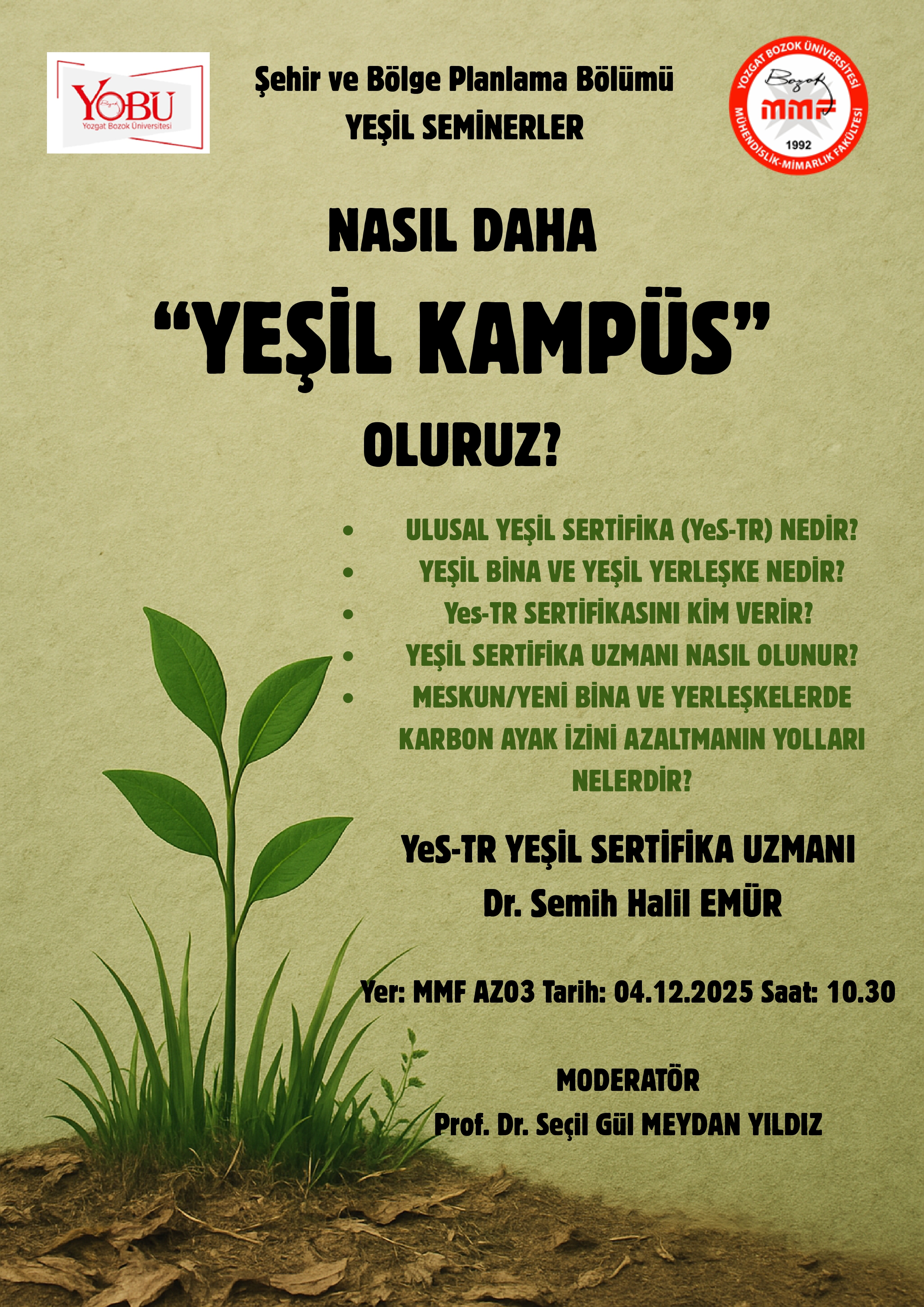 Bölümümüzde sosyokültürel faaliyetlere yönelik iyileştirme ve eğitim-öğretim sürecinde dış paydaş etkileşimlerini artırma amacıyla yeşil seminerler düzenlenmesi planlanmaktadır. Bu kapsamda Çevre Şehircilik ve İklim Değişikliği Bakanlığımızca verilen Yeşil Sertifika Uzmanlığı hakkında bilgilendirme yapılması amacıyla 04.12.2025 tarihinde saat 10.30, AZ03 nolu derslikte YeS-Tr Uzmanı ve Şehir ve Bölge Plancısı Dr. Semih Halil EMÜR katılımıyla "Nasıl Daha 'Yeşil Kampüs' oluruz?" başlıklı seminer gerçekleştirilmesi planlanmakta olup seminer posteri aşağıda bulunmaktadır. Katılımlarınızı bekliyoruz.