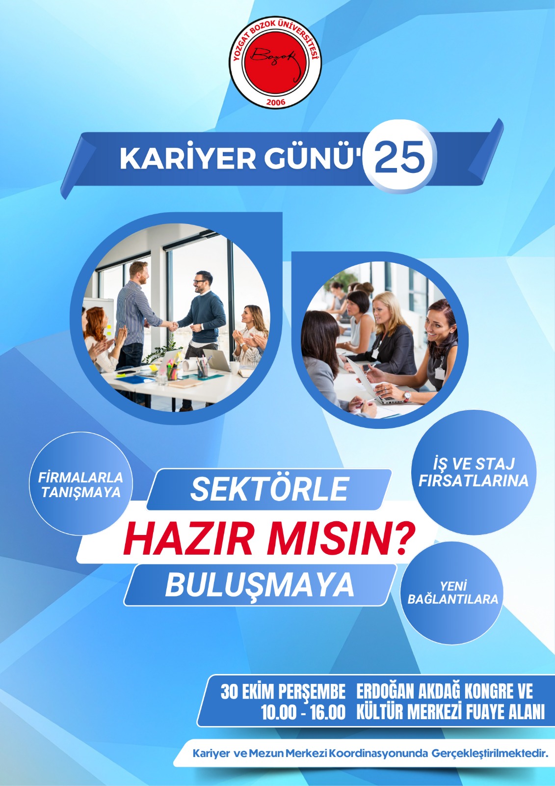 Kariyer Günü 25 Etkinliği Üniversitemiz öğrencilerinin kariyer planlamalarına katkı sağlamak ve sektör ile öğrencilerimizi buluşturmak amacıyla Kariyer ve Mezun Merkezi koordinasyonunda, 30 Ekim 2025 tarihinde Erdoğan Akdağ Kongre ve Kültür Merkezinde gerçekleştirilecektir. Mühendislik Mimarlık Fakültesi için 10:00-11:00 saatleri ayrılmıştır. Tüm öğrencilerimizin katılımını bekliyoruz.