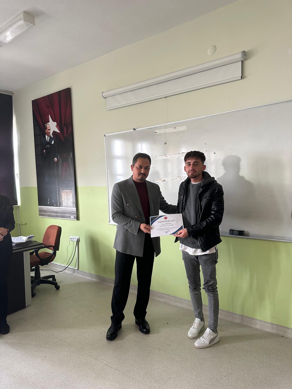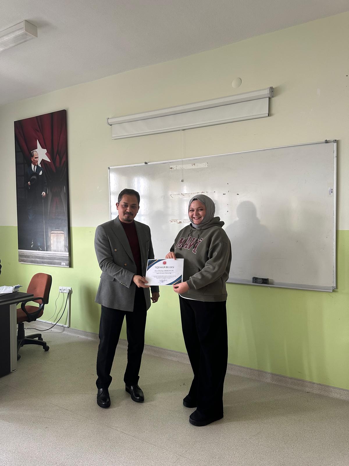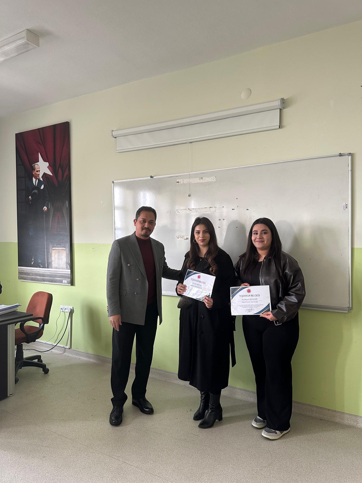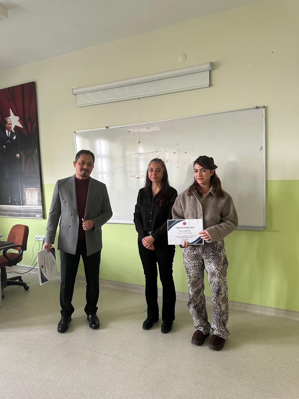 Dış Paydaşımız Yozgat Bozok Üniversitesi Sağlık Araştırma ve Uygulama Merkezi müdür yardımcısı M.Çağrı TOPAKTAŞ ve hastane kalite birimi personelleri katılımları ile uygulama dersi kapsamında öğrencilerimiz ile toplantı gerçekleştirilmiş olup başarılı olan öğrencilerimize belge takdimi yapılmıştır.