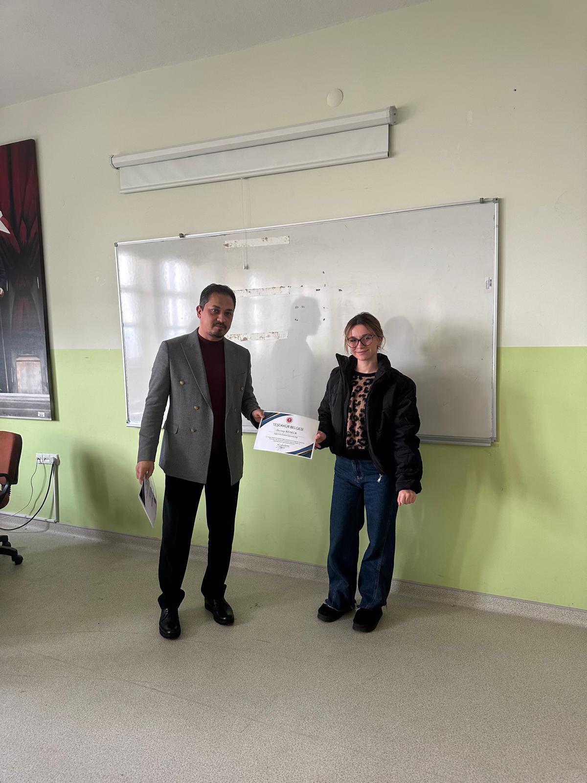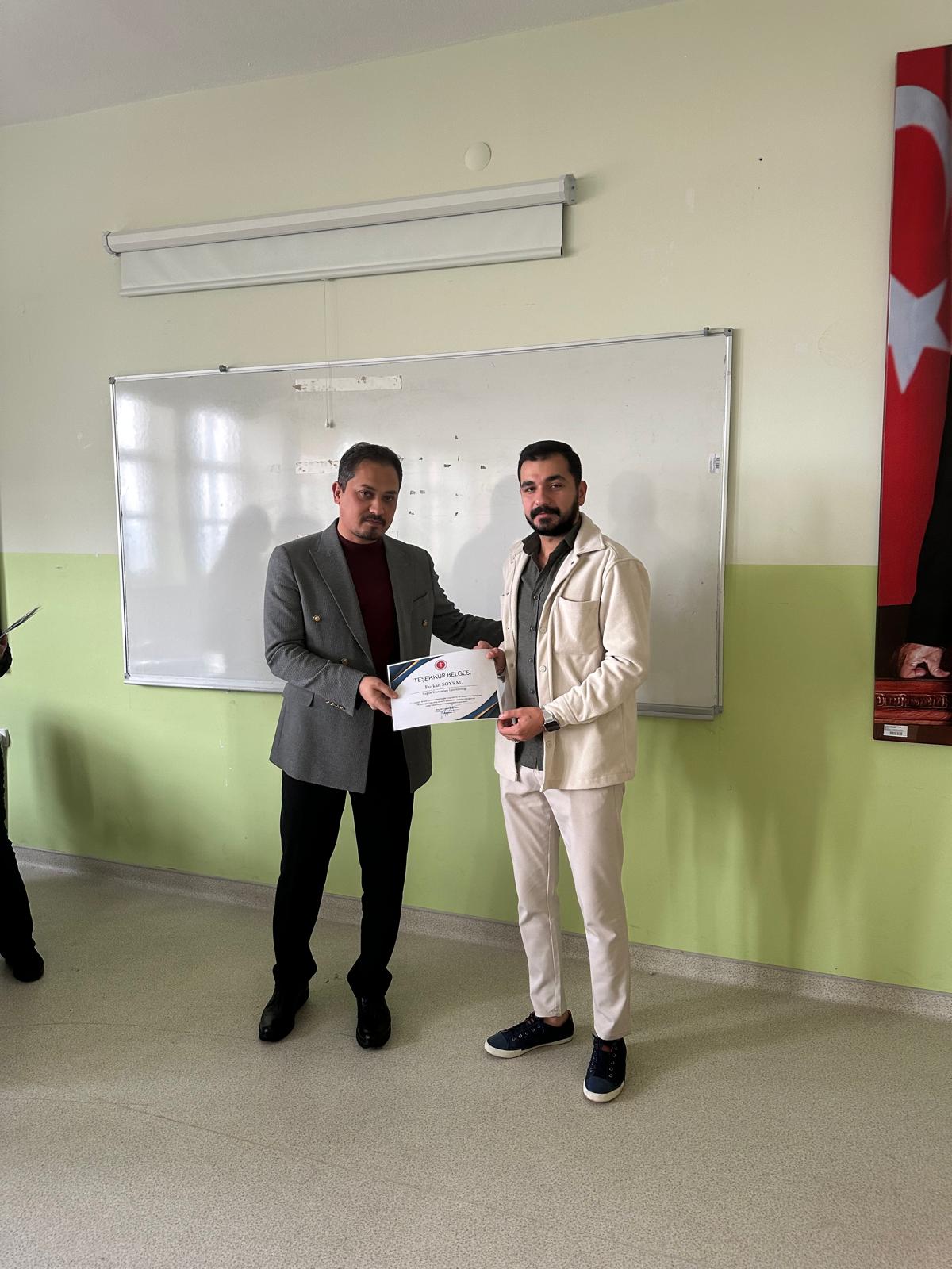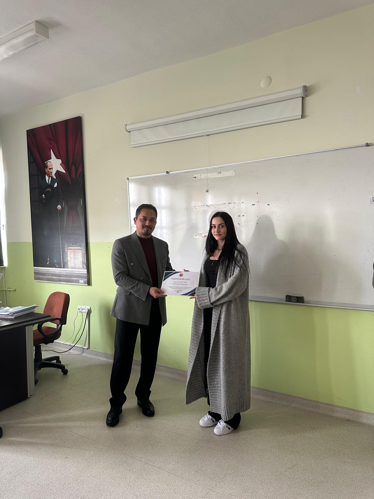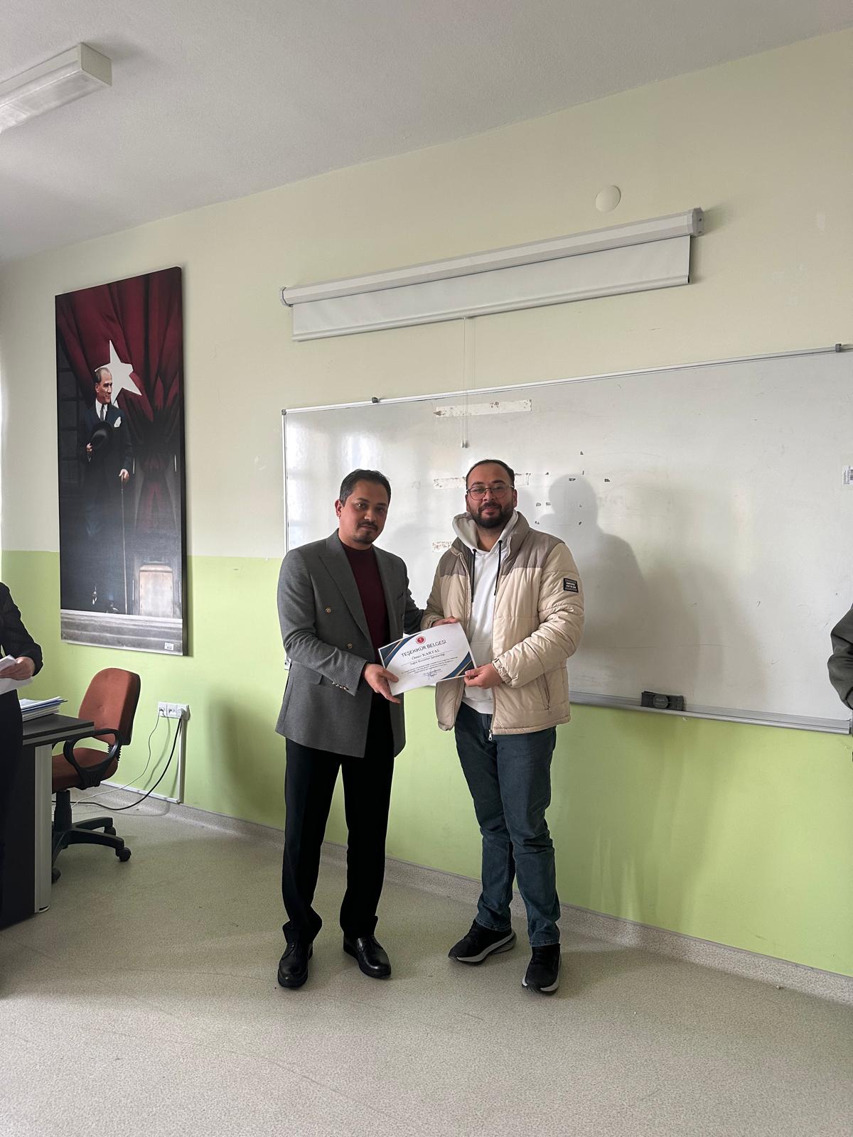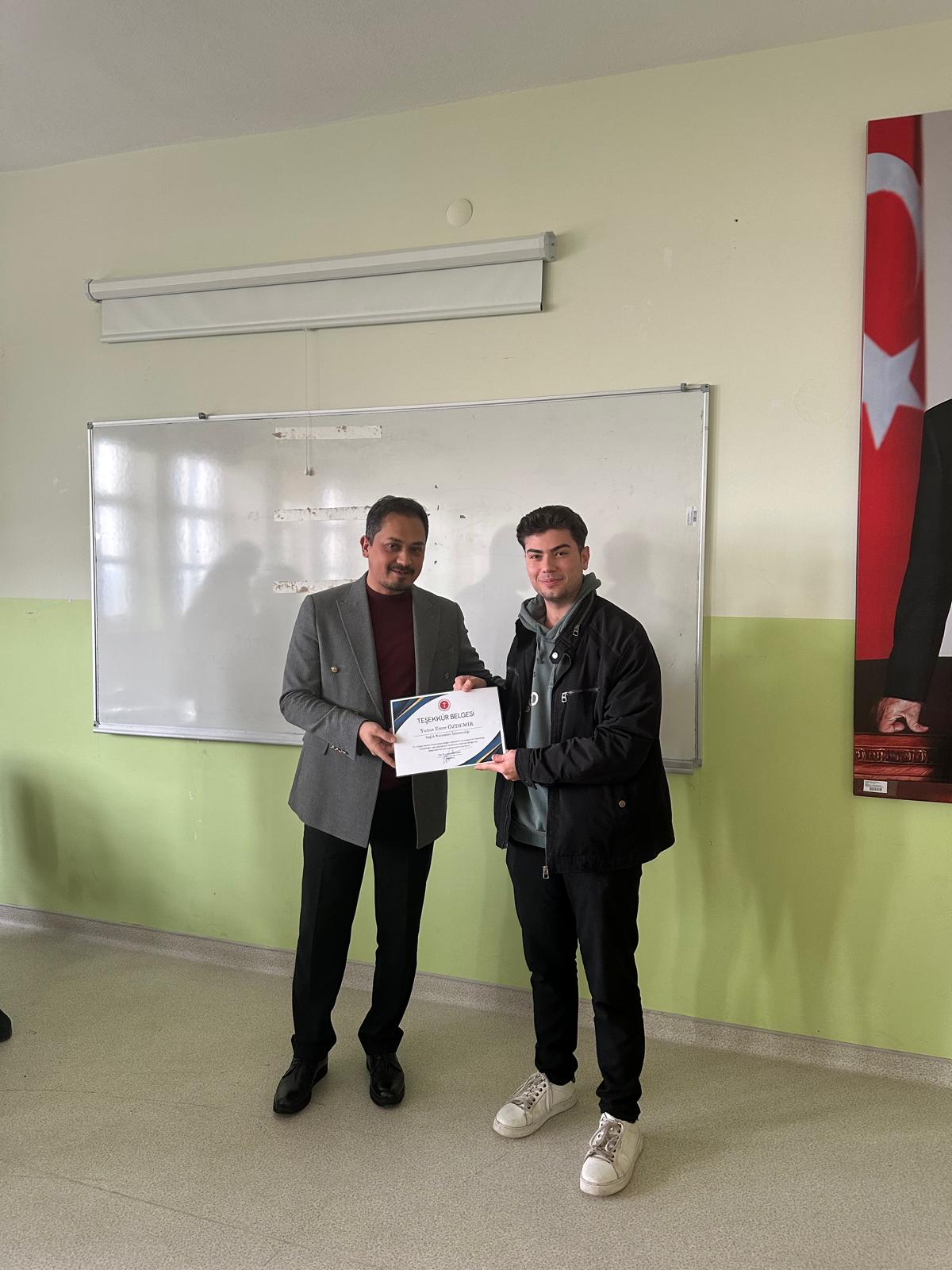 Dış Paydaşımız Yozgat Bozok Üniversitesi Sağlık Araştırma ve Uygulama Merkezi müdür yardımcısı M.Çağrı TOPAKTAŞ ve hastane kalite birimi personelleri katılımları ile uygulama dersi kapsamında öğrencilerimiz ile toplantı gerçekleştirilmiş olup başarılı olan öğrencilerimize belge takdimi yapılmıştır.