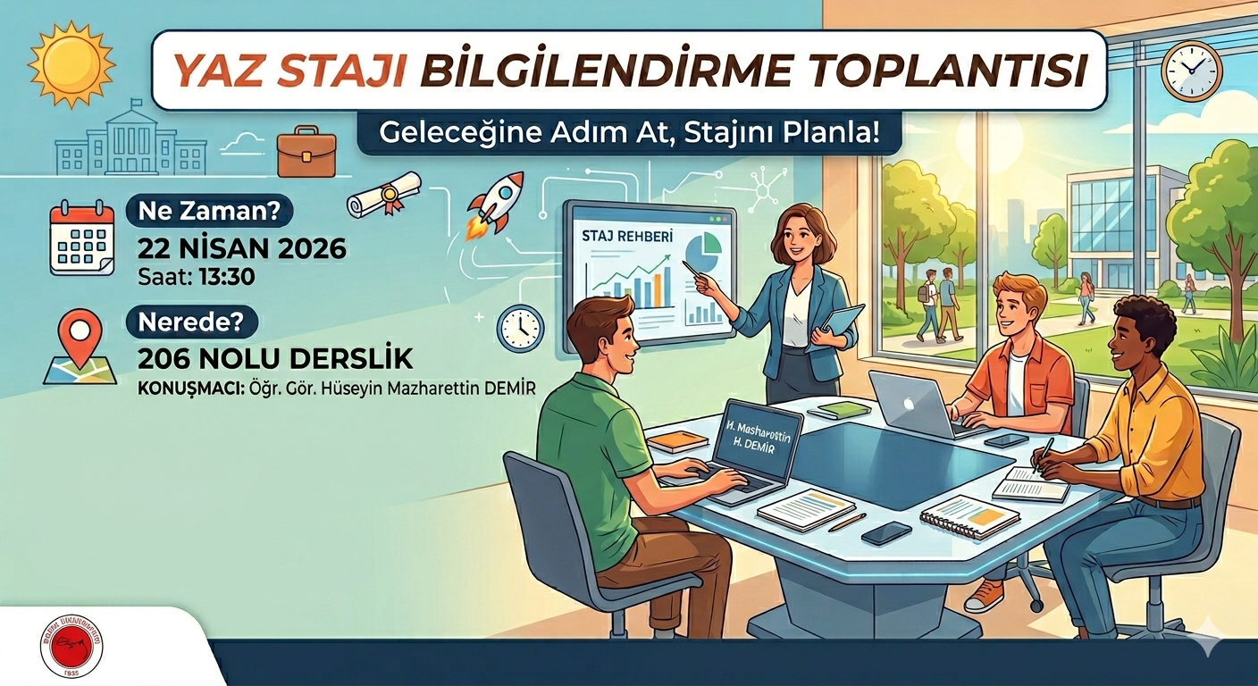 22.04.2026 Çarşamba günü saat 13.30'da Öğr. Gör. Hüseyin Mazharettin DEMİR tarafından yaz stajı bilgilendirme toplantısı yapılacaktır.