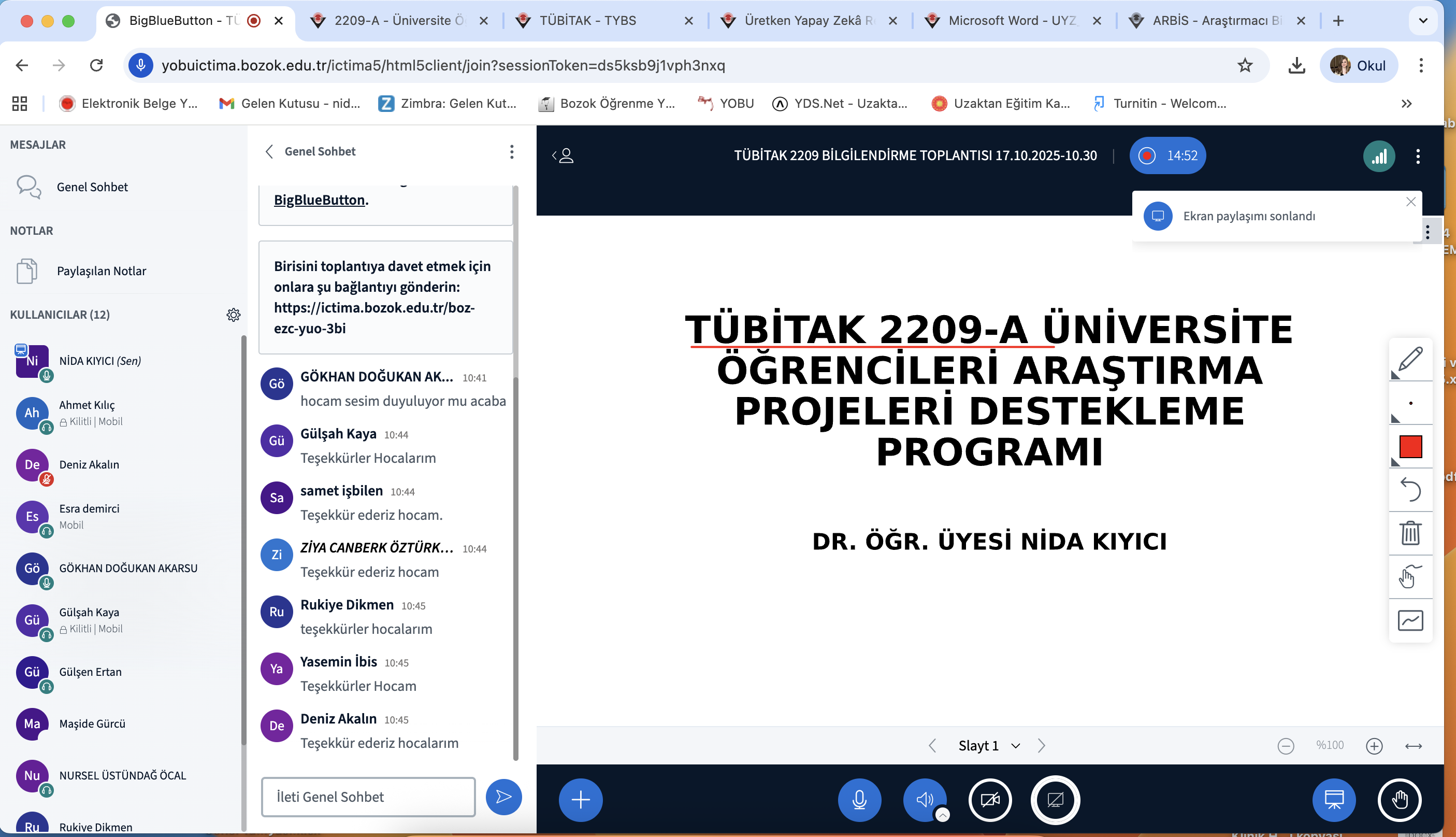 Tübitak 2209-A Üniversite Öğrencileri Araştırma Projeleri Destekleme Programı 12.10.2025 tarihinde başvuruya açılmıştır. Dr. Öğr. Üyesi Nida KIYICI tarafından bilgilendirme toplantısı gerçekleştirilmiştir.