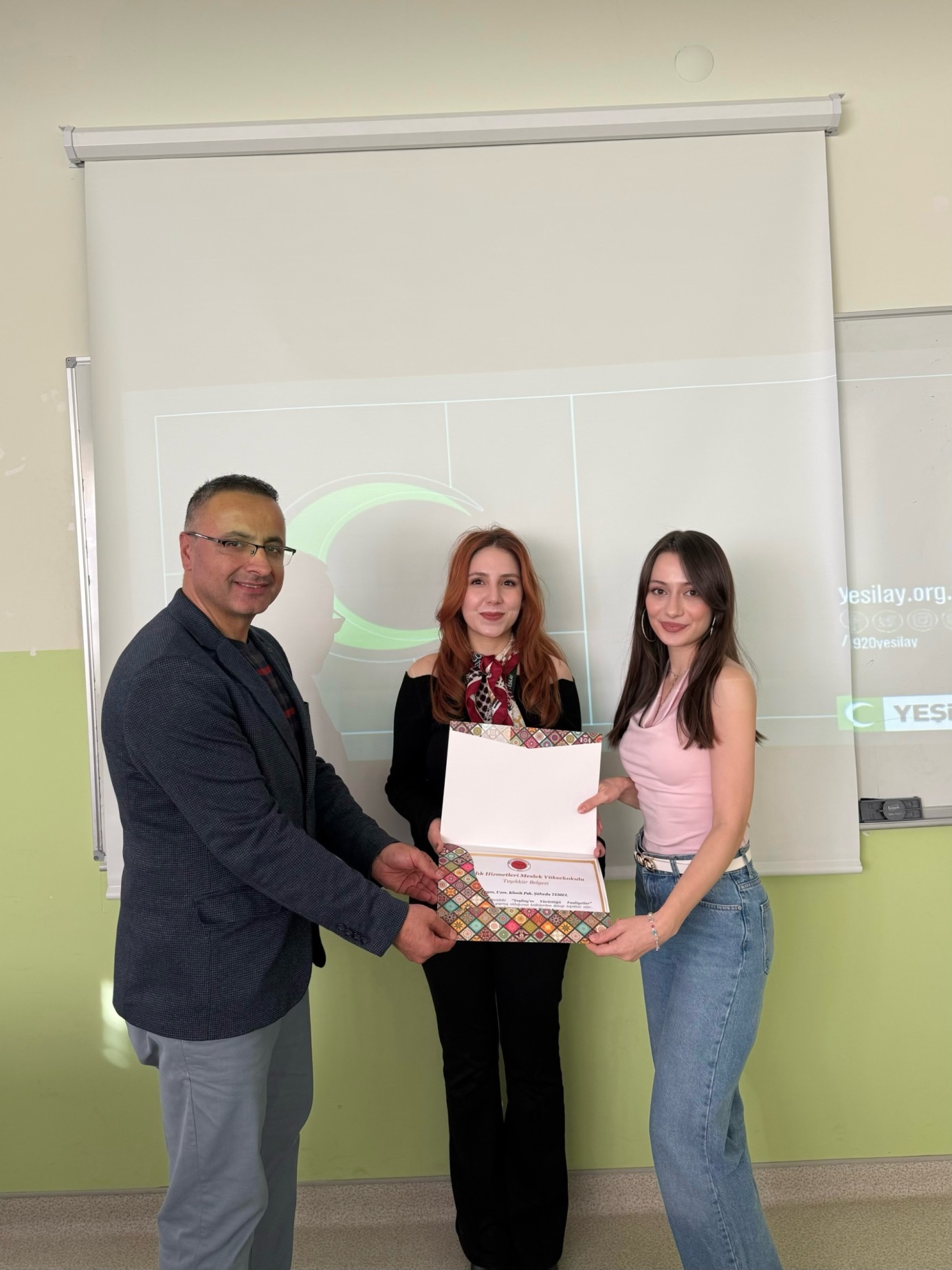 Yozgat Yeşilay Şubesi 22-23 Ekim 2025 tarihinde 13.30 da yüksekokulumuzu ziyaret ederek öğrencilere ve akademik personele yönelik tanıtım programı gerçekleştirdi. Etkinlik kapsamında Yeşilay tanıtılarak, Yeşilay'ın çalışmaları ve Yeşilay Danışmanlık Merkezi (YEDAM) hakkında detaylı bilgiler paylaşıldı. Yüksekokulumuzda gerçekleştirilen bu etkinlik, öğrencilerimizin bağımlılıkla mücadele konusunda bilinçlenmesine ve sağlıklı yaşam kültürünün yaygınlaştırılmasına katkı sağlamıştır. Yüksekokulumuzda gerçekleştirilen bu etkinlik vesilesiyle Yozgat Yeşilay Şubesi temsilcilerine ve akademik danışmanlara katkılarından dolayı teşekkür ederiz.
