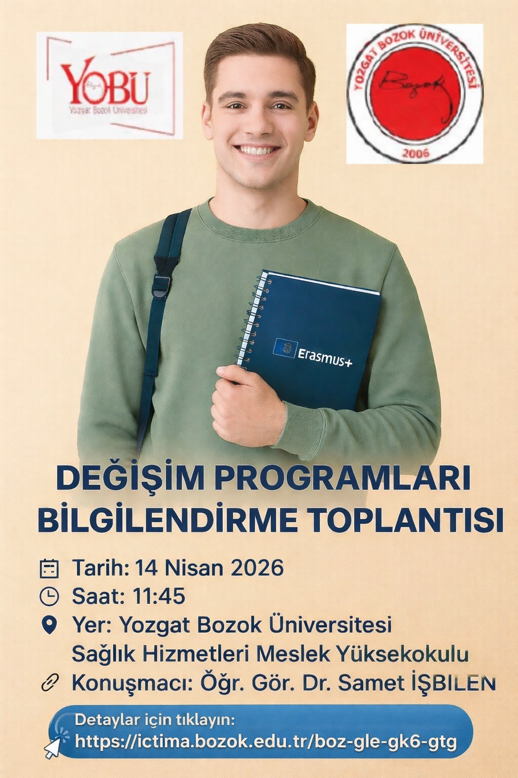 Yozgat Bozok Üniversitesi Sağlık Hizmetleri Meslek Yüksekokulu olarak öğrencilerimizi ulusal ve uluslararası değişim olanakları hakkında bilgilendirmek amacıyla Erasmus+, Mevlana ve Farabi Değişim Programlarına yönelik bir bilgilendirme toplantısı düzenliyoruz.