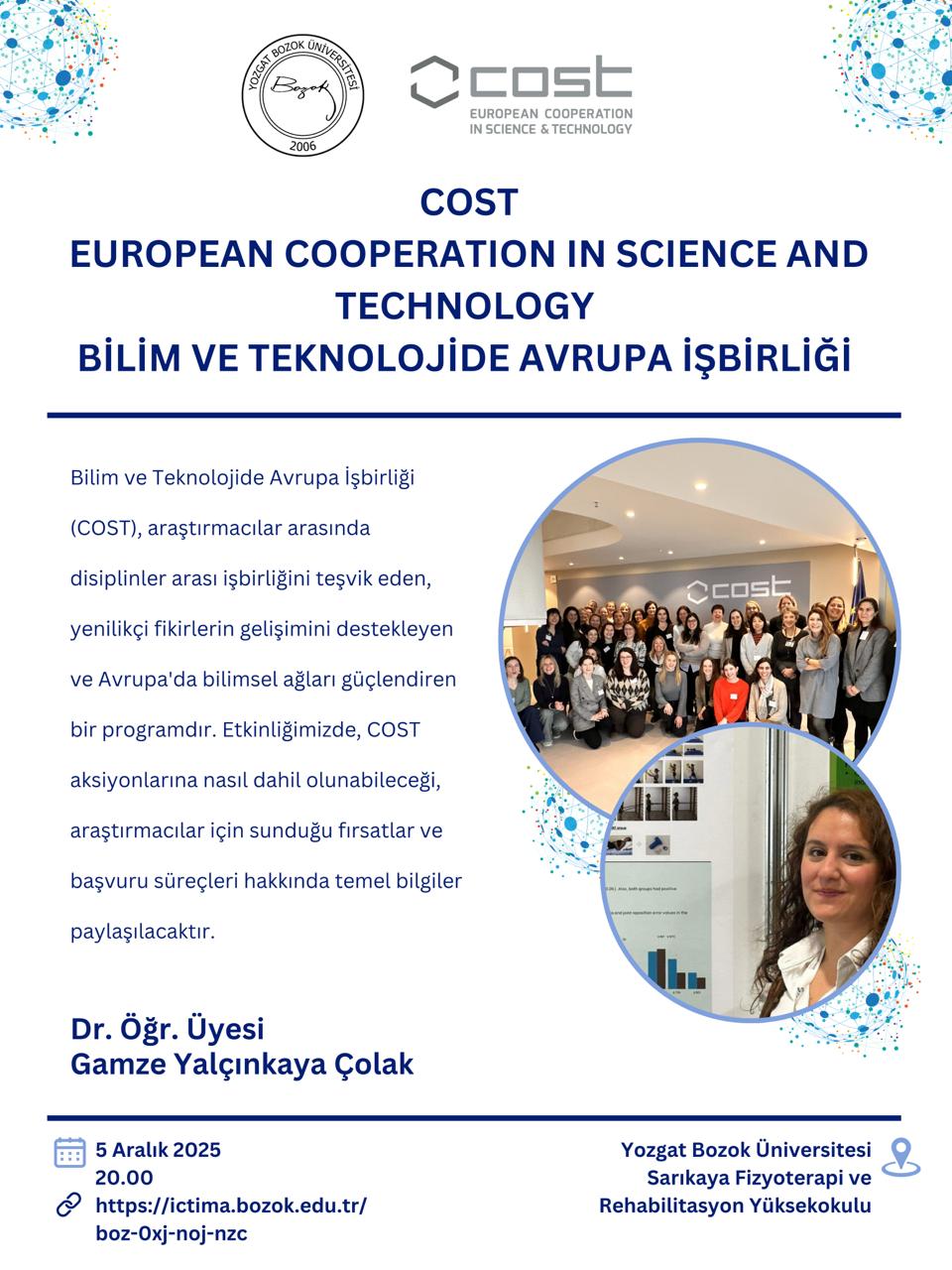 COST programı; disiplinler arası iş birliğini teşvik eden, yenilikçi araştırma fikirlerini destekleyen ve Avrupa genelinde bilimsel ağları güçlendiren önemli bir girişimdir. Etkinlikte, COST aksiyonlarına nasıl dahil olunabileceği, araştırmacılara sunduğu fırsatlar ve başvuru süreçleri hakkında temel bilgiler paylaşılacaktır.