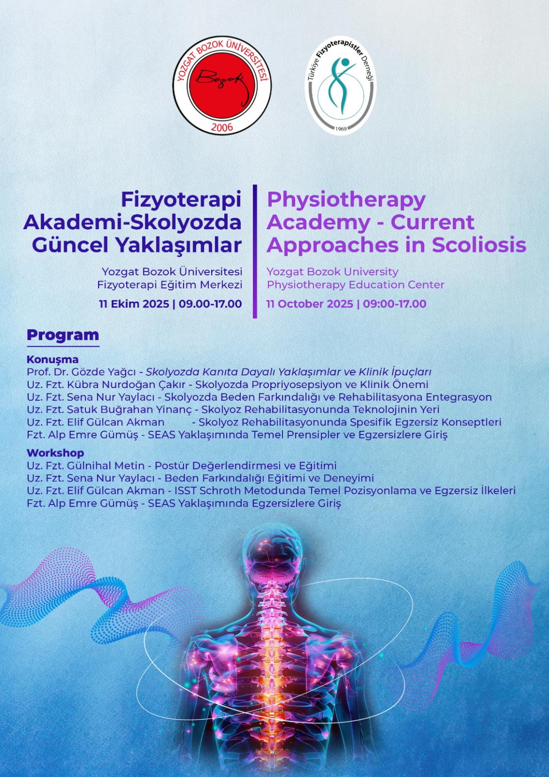 Etkinlikte alanında uzman akademisyen ve fizyoterapistler tarafından konferanslar ve uygulamalı workshoplar gerçekleştirilecektir. Program kapsamında skolyozda beden farkındalığı, propriosepsiyon, SEAS ve Schroth yöntemleri, postür değerlendirme ve eğitim uygulamaları gibi birçok konu detaylı şekilde ele alınacaktır.