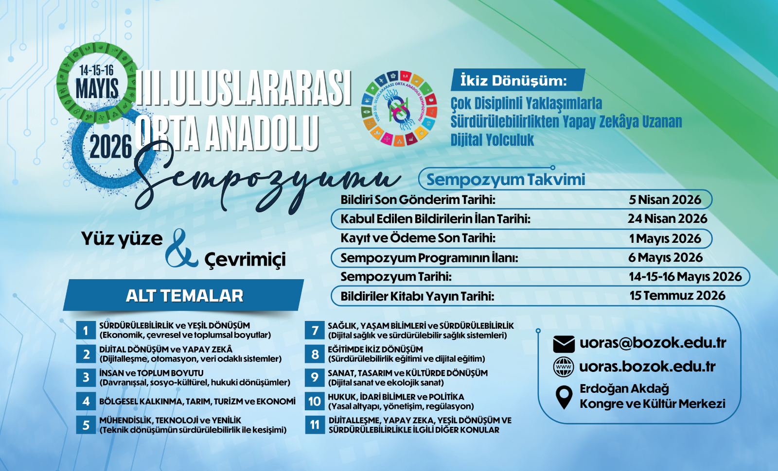 III. Uluslararası Orta Anadolu Sempozyumu, 14-15-16 Mayıs 2026 tarihlerinde yüz yüze ve çevrimiçi olarak gerçekleştirilecektir. Bu yılın ana teması “İkiz Dönüşüm: Çok Disiplinli Yaklaşımlarla Sürdürülebilirlikten Yapay Zekâya Uzanan Dijital Yolculuk” olup; sürdürülebilirlik, dijital dönüşüm ve yapay zekâ ekseninde çok disiplinli bildiri ve çalışmalara açıktır. Etkinlik Erdoğan Akdağ Kongre ve Kültür Merkezi’nde düzenlenecektir.