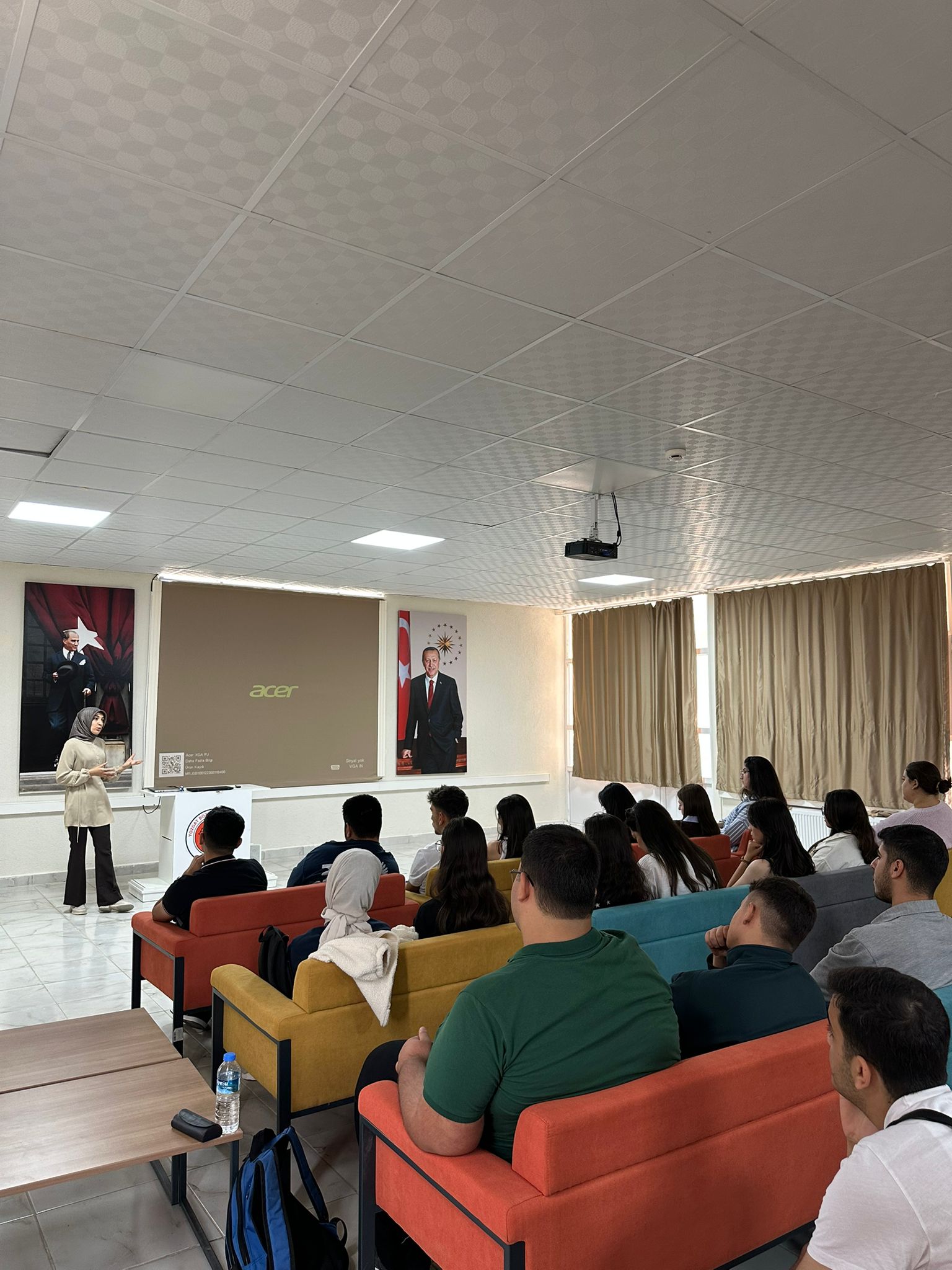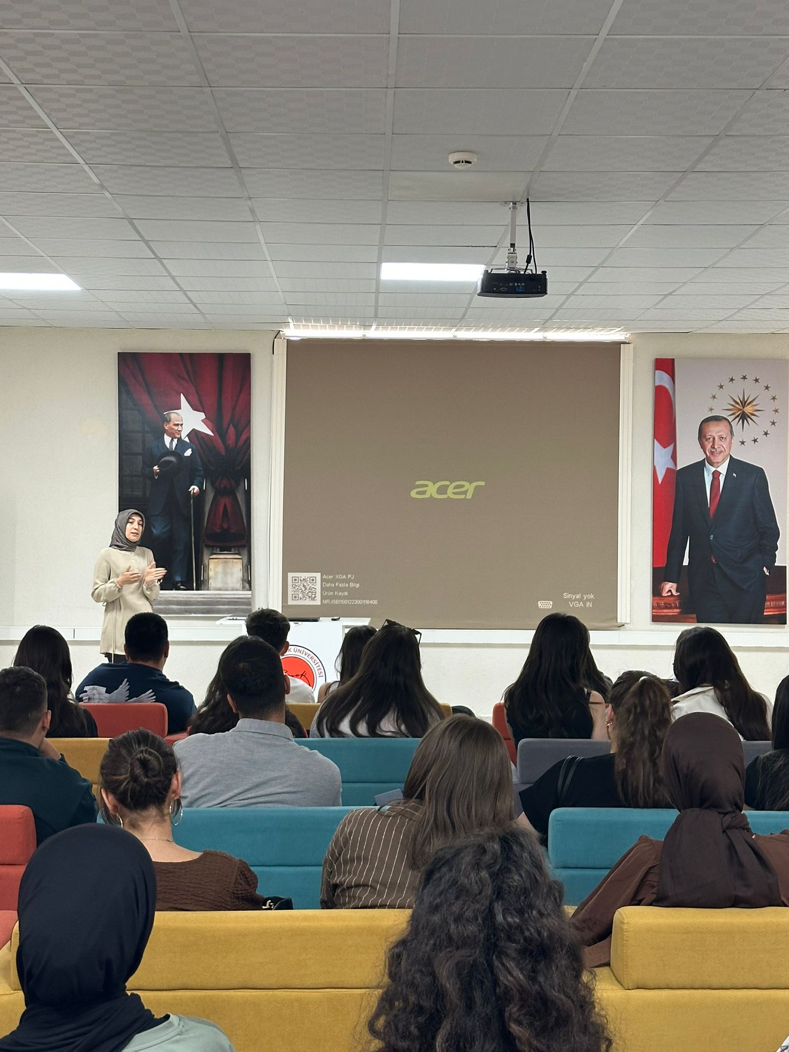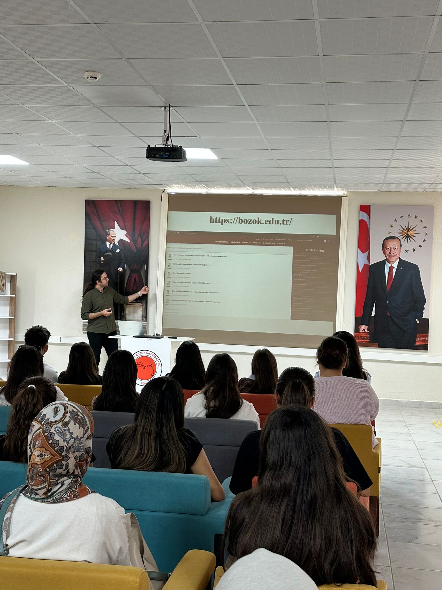 Programın devamında ise Öğr. Gör. Satuk Buğrahan Yinanç, öğrencilere üniversite ve yüksekokul hakkında kapsamlı bir tanıtım yaptı. Öğrenci Bilgi Sistemi (OBS) ve BOYSİS’in kullanımı, bağımlılıkla mücadele konusunda farkındalık, engelli öğrenci biriminin sunduğu imkânlar, uluslararası ilişkiler ofisinin sağladığı fırsatlar ve SOBİ-EK hakkında bilgiler verdi. Ayrıca akademik süreçlere dair önemli noktaları paylaştı. Yeni dönem birinci sınıf öğrencilerinin akademik danışmanı olarak öğrencilerle tanıştı.