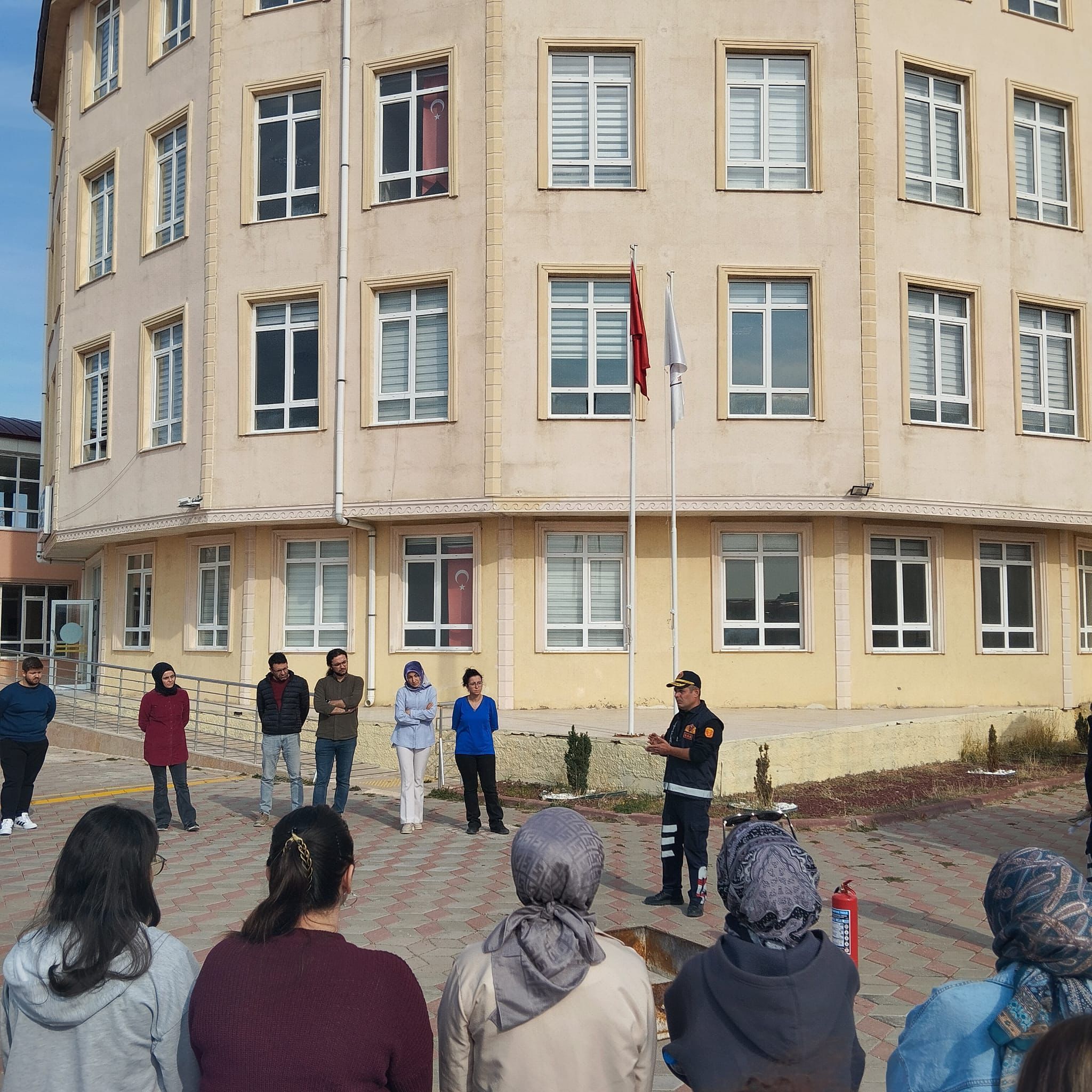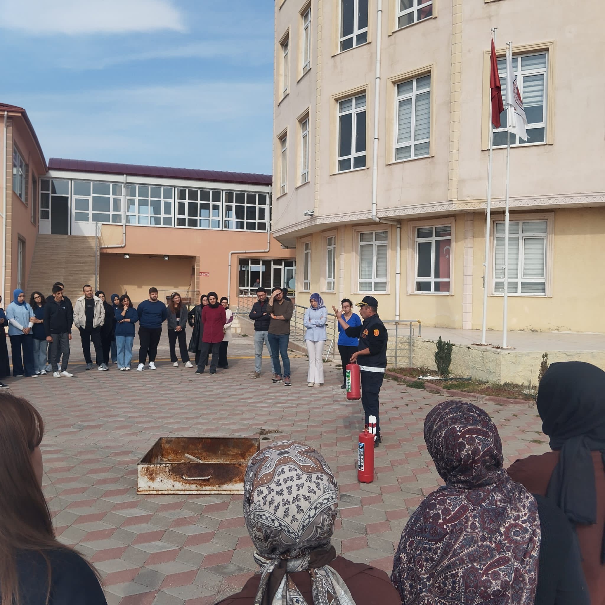 Tatbikat kapsamında İtfaiye Müdürü tarafından yangın güvenliği, yangına müdahale yöntemleri ve deprem anında alınması gereken önlemler hakkında bilgilendirme eğitimi verildi. Eğitimin ardından, yangın söndürme cihazlarının kullanımı uygulamalı olarak gösterilerek, öğrenci ve personelin afet bilinci artırıldı.