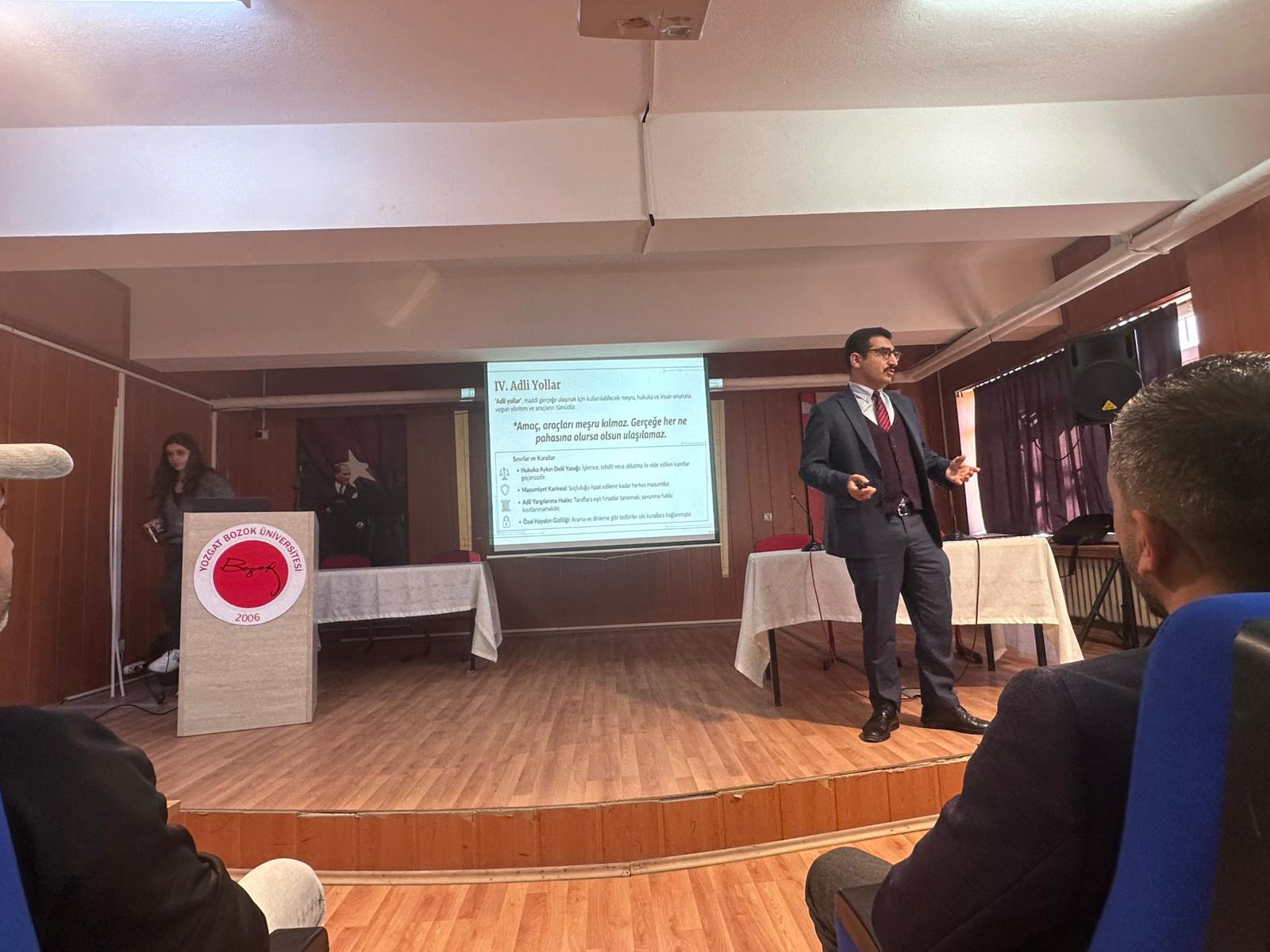 Şefaatli Meslek Yüksekokulunda, Ceza Muhakemesi ve Olay Yeri Yönetimi konulu bilgilendirici bir sunum gerçekleştirildi. Etkinlik, Şefaatli Cumhuriyet Savcısı Mehmet Ali Öztosun’nun konuşmacı olarak katılımıyla yapıldı. Savcı Mehmet Ali Öztosun, ceza soruşturmalarının yürütülmesi, olay yeri incelemesinin adli süreçteki kritik rolü ve uygulamada karşılaşılan örnek vakalar hakkında katılımcılara kapsamlı bilgiler verdi.