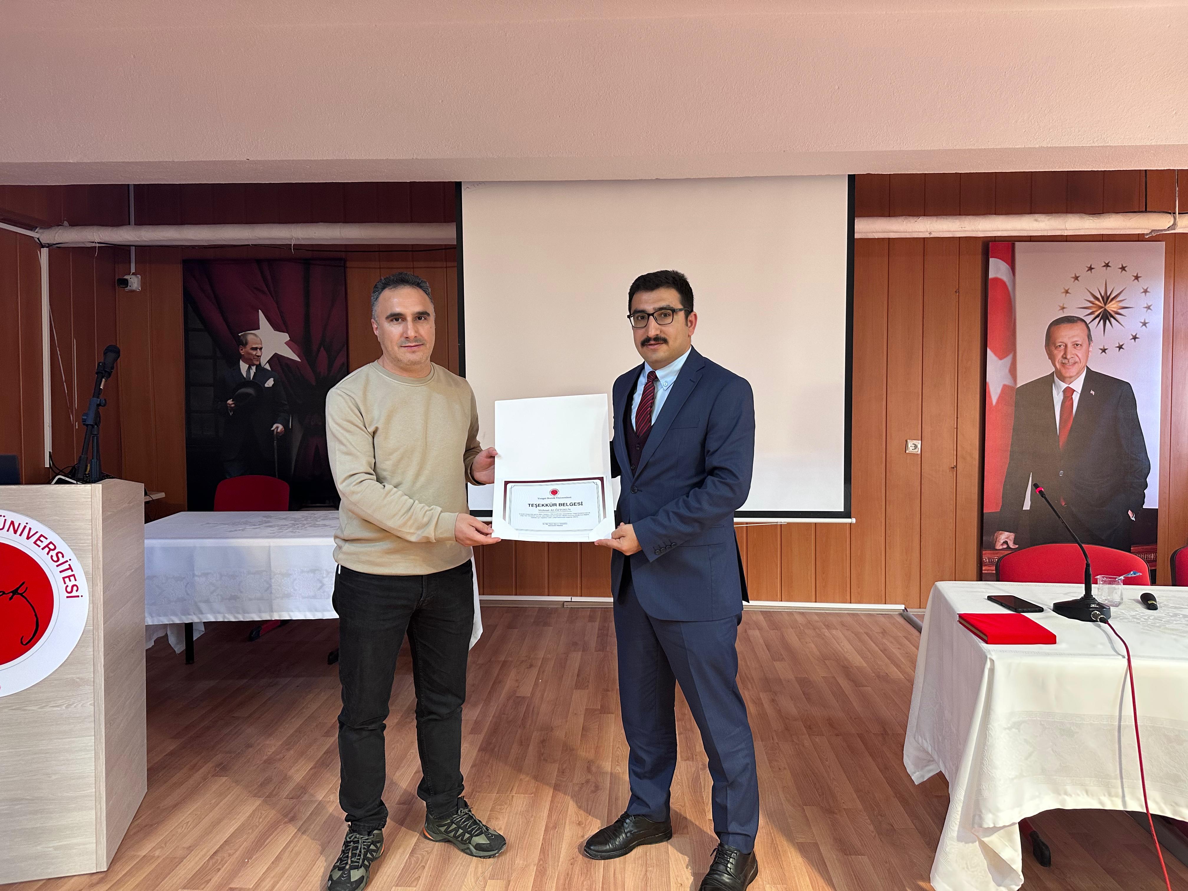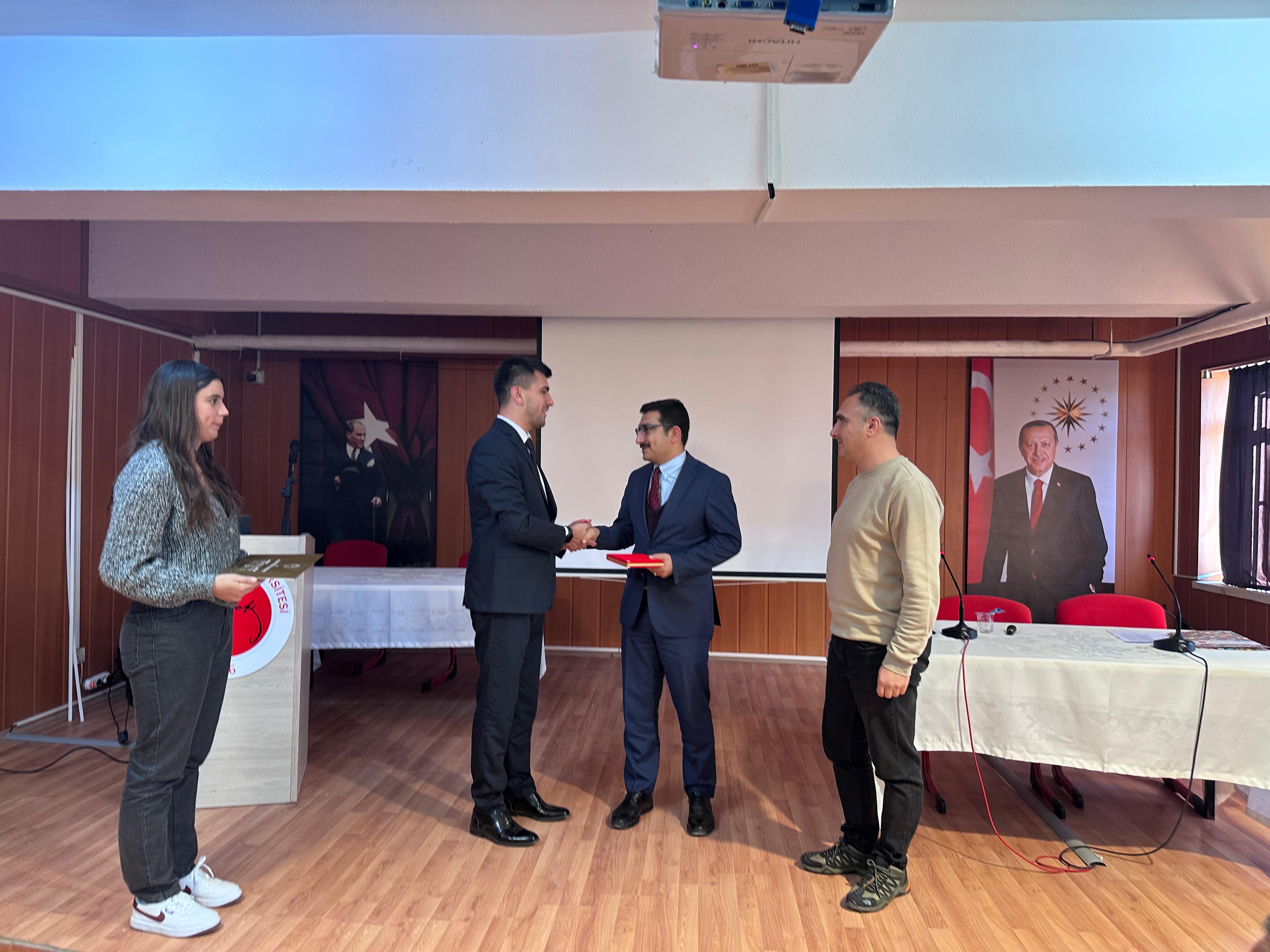 Programın sonunda, katkılarından dolayı Şefaatli Cumhuriyet Savcısı Mehmet Ali Öztosun'a Yüksekokul Müdürü Dr. Öğr. Üyesi Alperen Erdoğan tarafından plaket, moderatör Öğr. Gör. Latif Gökalp tarafından ise teşekkür belgesi takdim edildi.