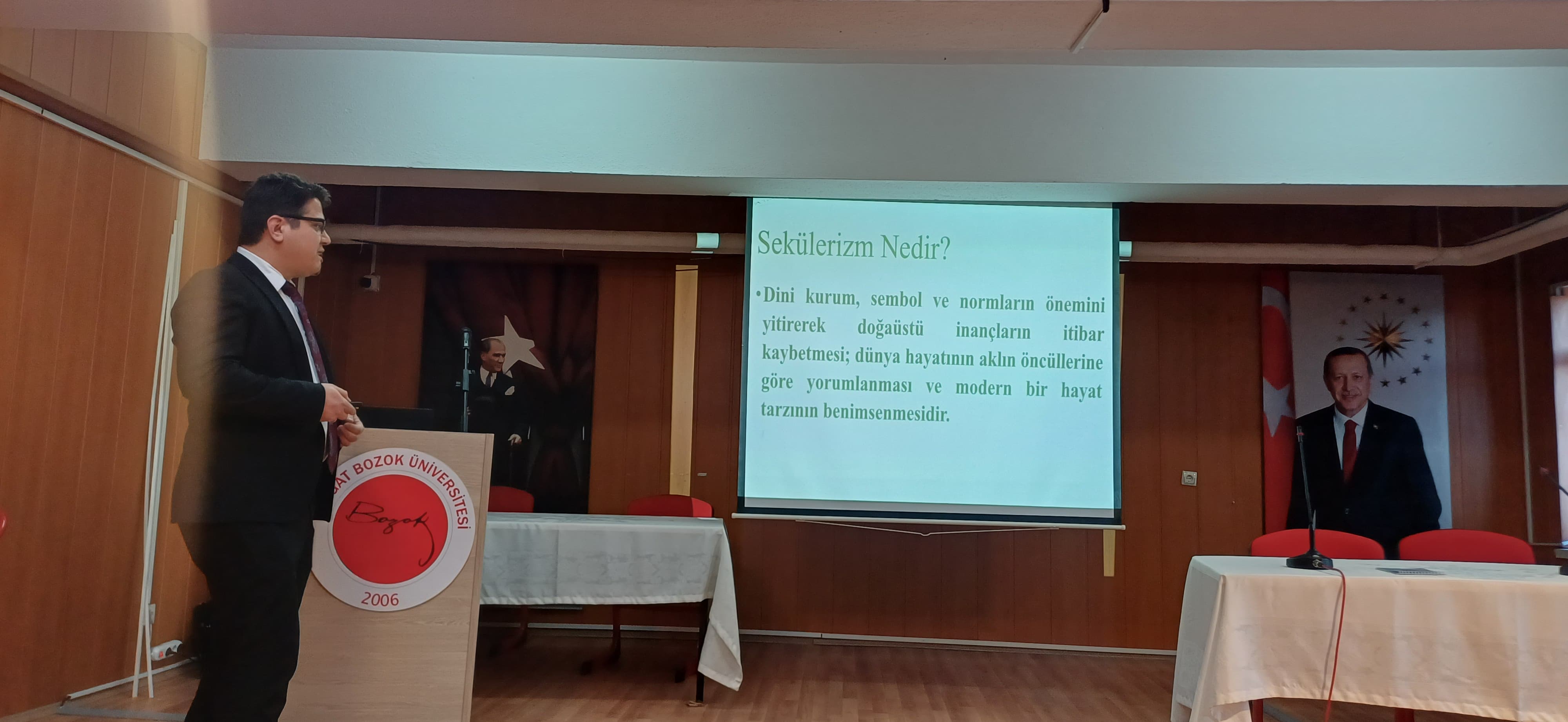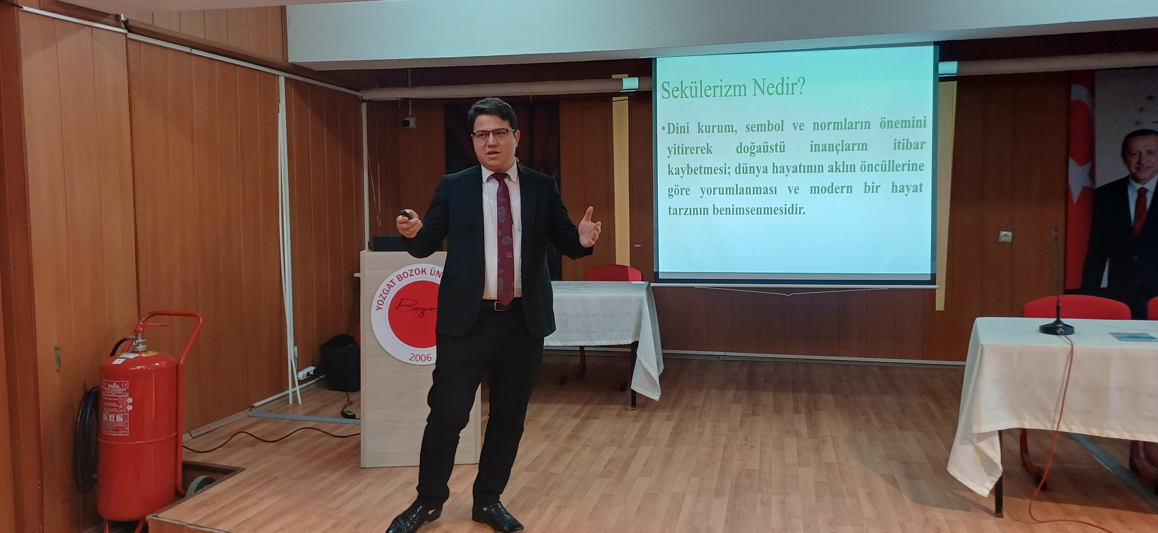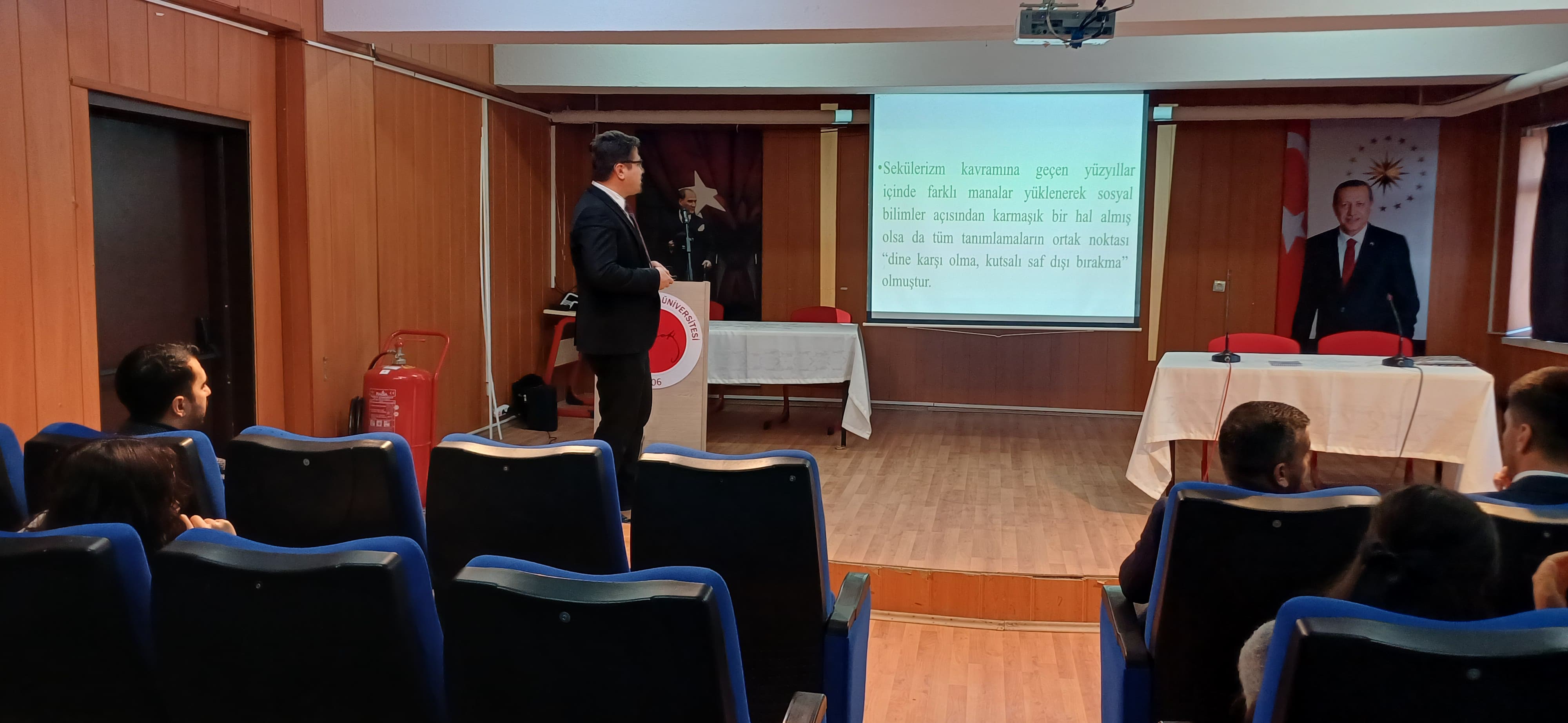 Şefaatli Meslek Yüksekokulunda, Şefaatli Müftülüğü Vaizi Hasan Karabacakoğlu tarafından “Sekülarizm” konulu bir seminer verildi. Akademik ve toplumsal açıdan önemli başlıklara değinilen programda, sekülarizmin tarihsel gelişimi, kavramın modern toplumlarda nasıl yorumlandığı ve din–devlet ilişkileri bağlamında ortaya çıkan farklı yaklaşımlar ele alındı.