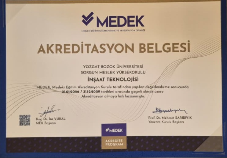 Meslek Yüksekokulumuz İnşaat Teknolojisi Programı, MEDEK (Mesleki Eğitim Değerlendirme ve Akreditasyon Derneği) tarafından yapılan değerlendirmeler sonucunda akredite edilmeye hak kazanmıştır.