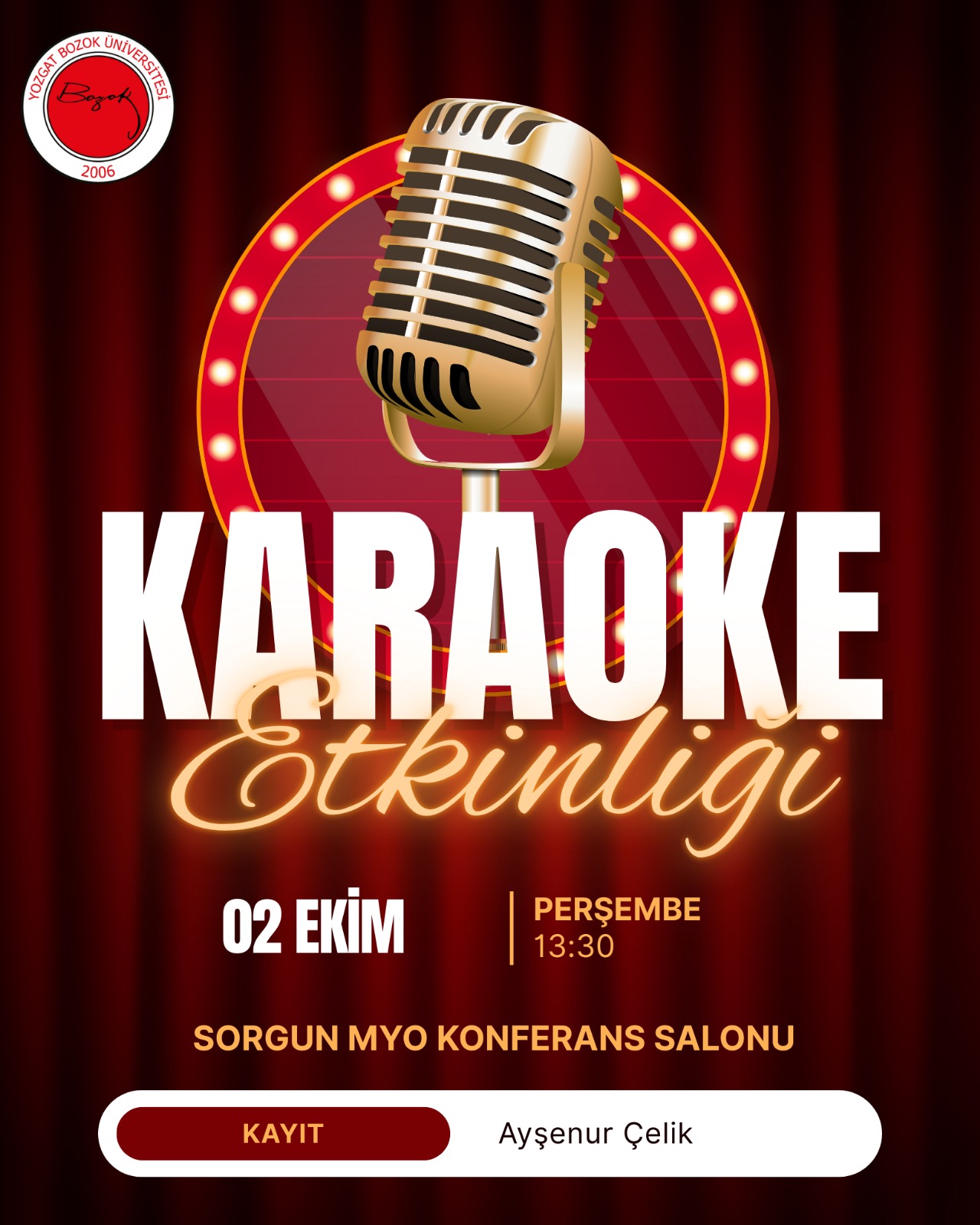 Sorgun Meslek Yüksekokulu’nda 2 Ekim tarihinde eğlenceli bir karaoke etkinliği düzenlenecektir. Öğrencilerimiz ve hocalarımızın katılımıyla keyifli anılar biriktireceğimiz bu etkinliğe bekliyoruz!