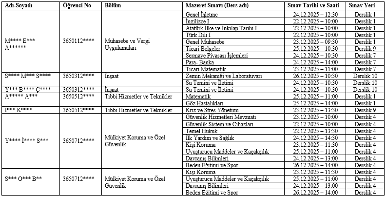 2025-2026 EĞİTİM ÖĞRETİM YILI GÜZ DÖNEMİ MAZERET SINAVI PROGRAMI