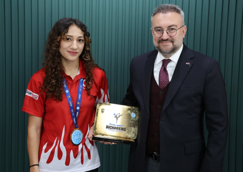 Üniversitemiz Rektörü Prof. Dr. Evren Yaşar, 21–30 Kasım 2025 tarihlerinde Birleşik Arap Emirlikleri’nin başkenti Abu Dabi’de düzenlenen Dünya Büyükler Kick Boks Şampiyonasında altın madalya kazanarak dünya şampiyonu olan Spor Bilimleri Fakültesi öğrencimiz Betül Zararsız’ı makamında kabul etti.