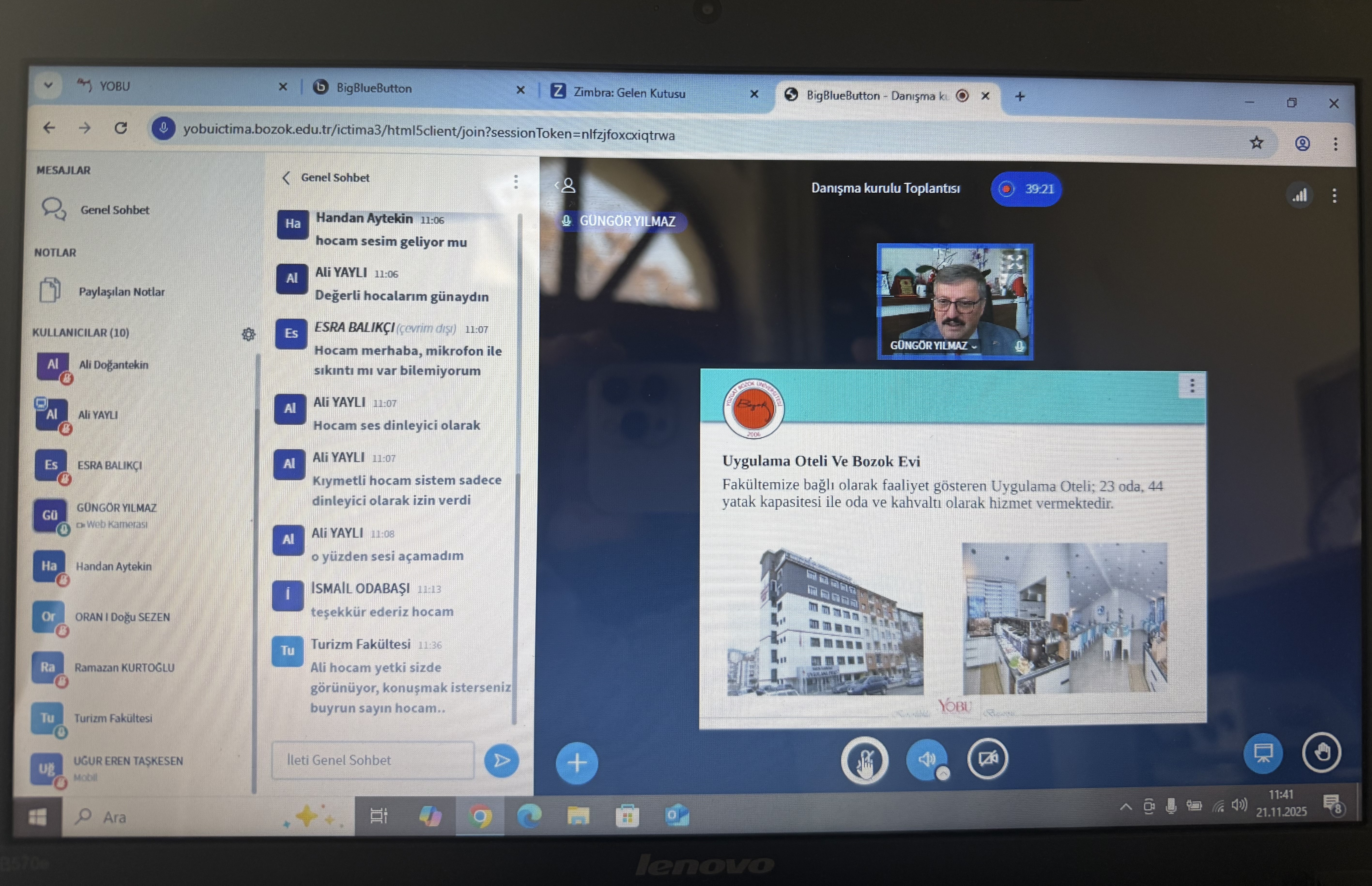 Dekanımız Prof. Dr. Güngör YILMAZ başkanlığında, 21 Kasım 2025 Cuma günü saat 11:00’de “Fakülte Danışma Kurulu Toplantısı” gerçekleştirildi. Bozok İçtima üzerinden online olarak yapılan toplantıya Dekan Yardımcımız, Fakültemiz akademisyenleri ve Dış Kurul üyeleri katıldı. Toplantıda, Yozgat özelinde turizmin geliştirilmesi ve Gastronomi ve Mutfak Sanatları Bölümüne öğrenci alınması konusunda fikir alış verişinde bulunuldu.