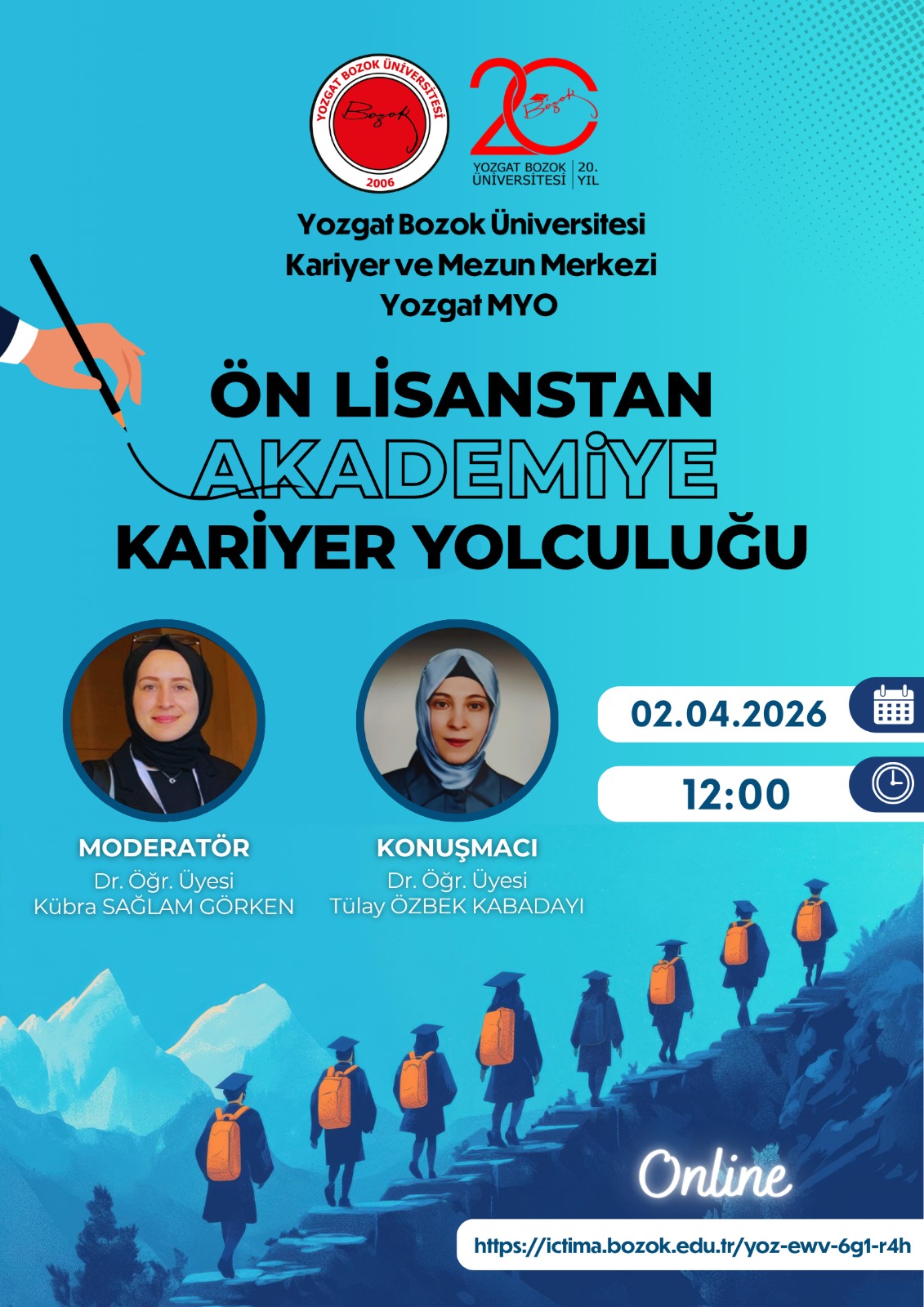 Sektör Günleri Etkinlikleri-2 kapsamında Dr. Öğr.Üyesi Kübra SAĞLAM GÖRKEN moderatörlüğünü yaptığı Dr. Öğr.Üyesi Tülay ÖZBEK KABADAYI' nın konuşmacı olarak katılacağı "Ön lisanstan Akademiye Kariyer Yolculuğu" başlıklı etkinlik ile ilgili bilgiler afişte yer almaktadır.