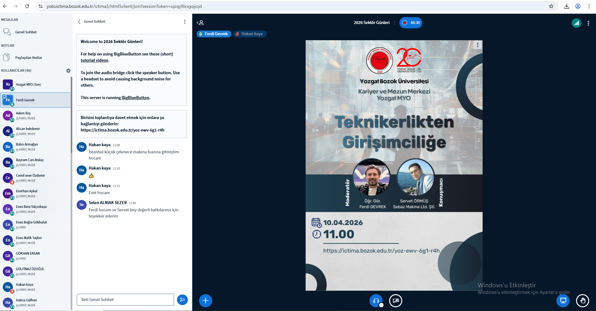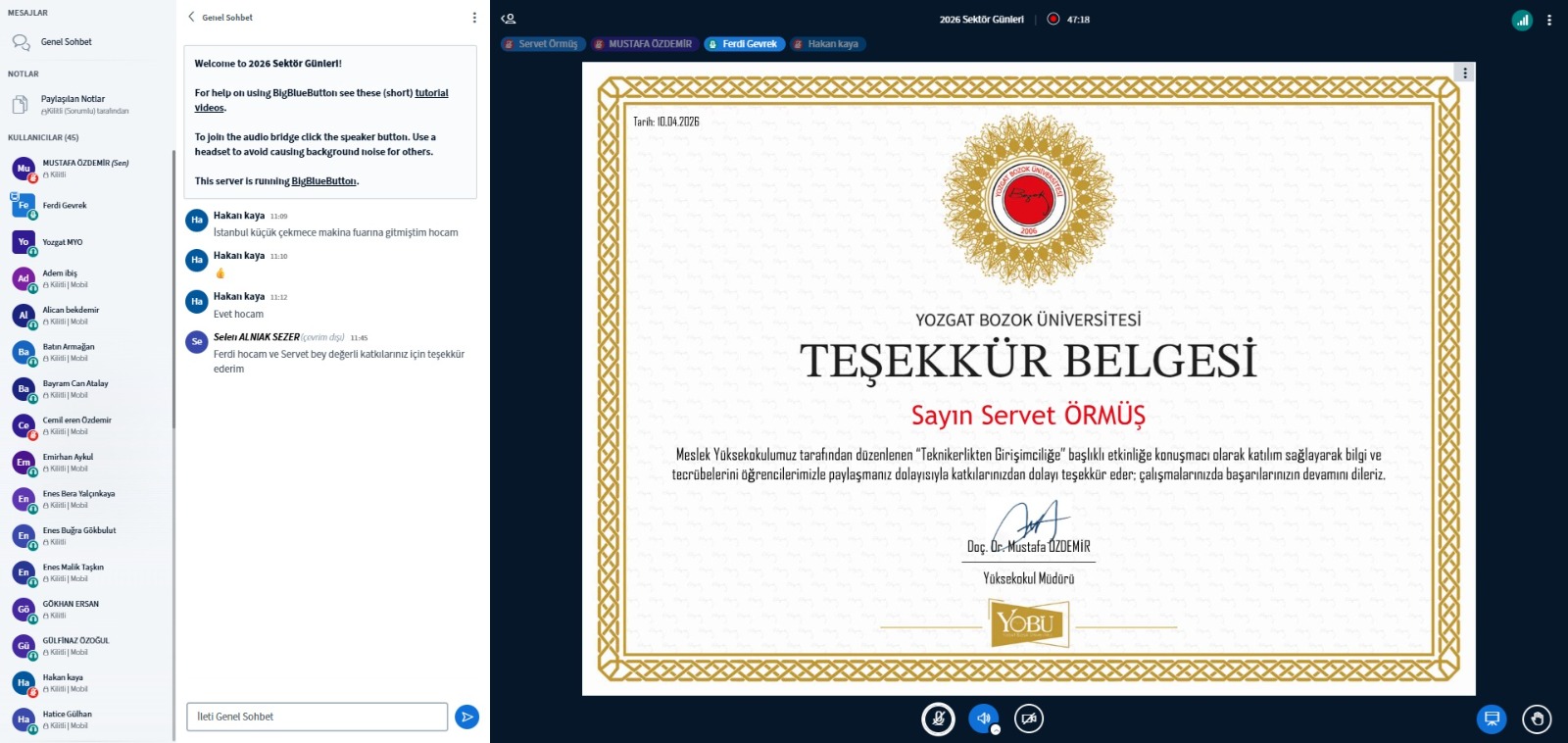 Yozgat Meslek Yüksekokulu ile Kariyer ve Mezun Merkezi iş birliğinde düzenlenen “Teknikerlikten Girişimciliğe” başlıklı online söyleşi, öğrencilerin yoğun katılımıyla gerçekleştirildi.